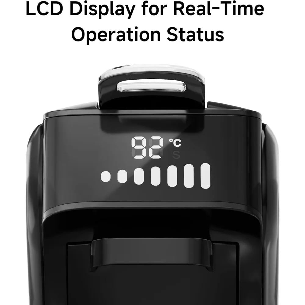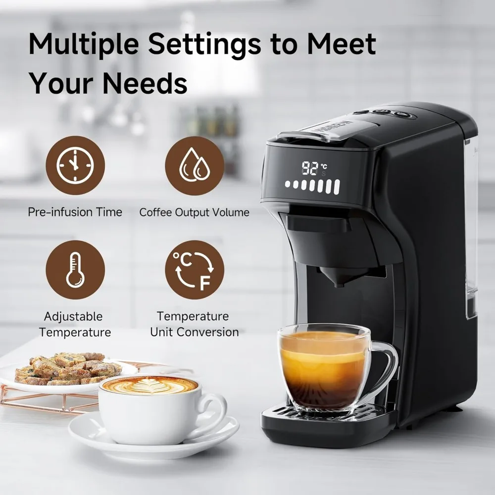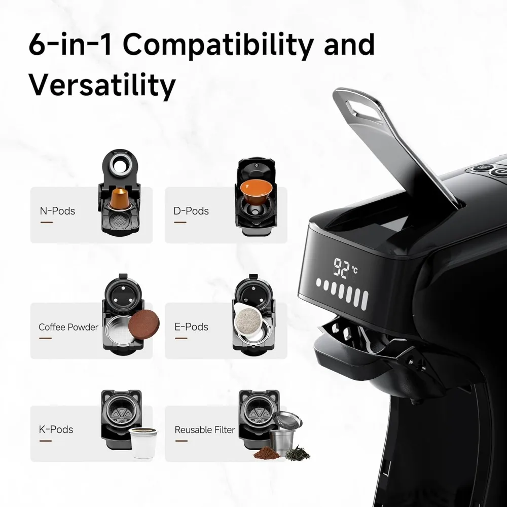 This versatile 6-in-1 pod coffee machine includes the brewer only (pods not included) and works with multiple formats: K-Cup, Nes* capsules, DG* capsules, E.S.E. pods, and standard espresso powder. It offers both cold and hot brewing modes—brew iced coffee in summer or hot coffee in winter—with a brief ~35-second preheat for hot mode.