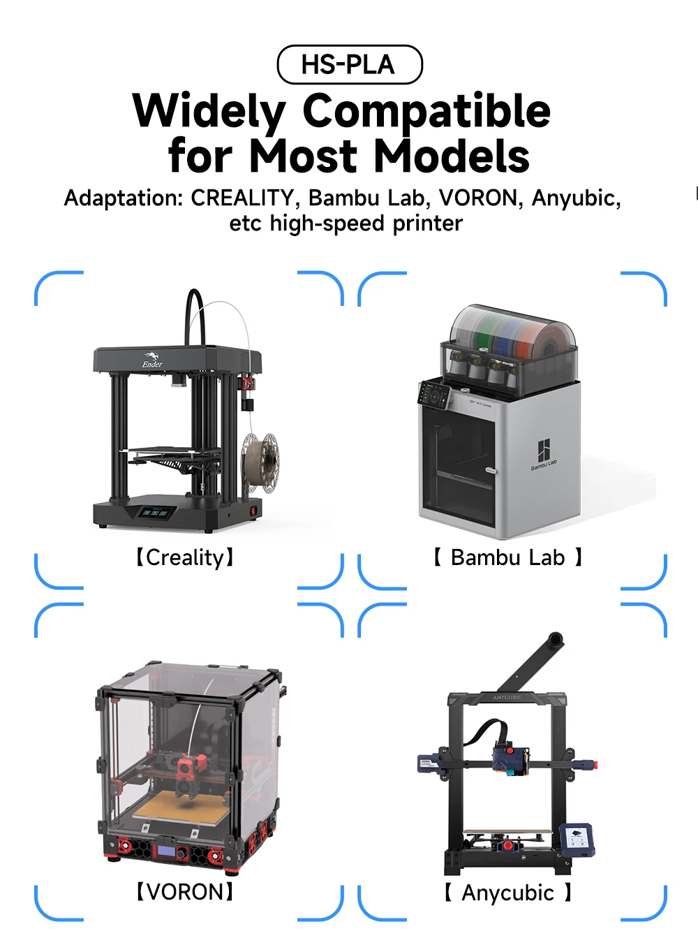 With better, speedy printing performance, HS-PLA is especially compatible with high-speed printers, such as AnkerMake M5, Bambu Lab X1/P1P, Creality K1/K1 MAX, Flsun V400, Raise3D Pro3/RMF500, etc.