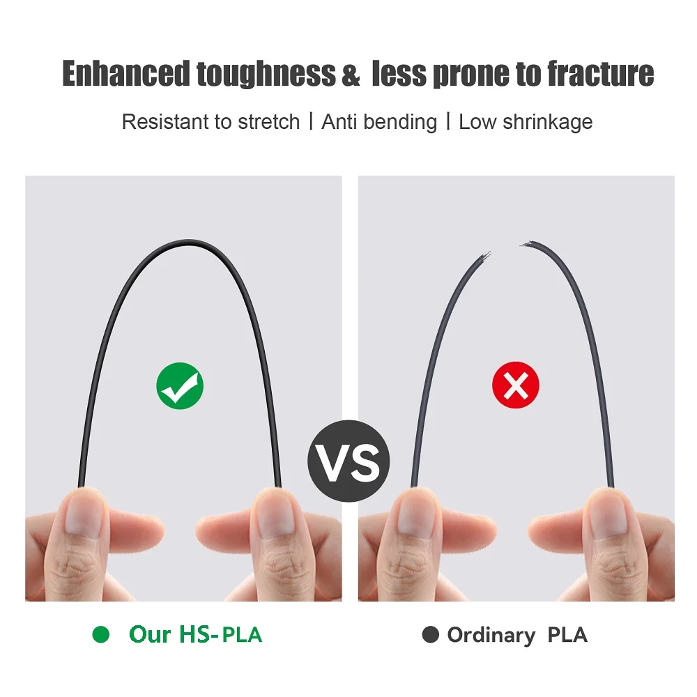 HS-PLA has minimum tolerance and low warping to ensure consistent feeding and stable prints, good layer bonding, less stringing, no bubbles, no cracking, no deformation, and easy handling, resulting in an outstanding surface finish and high precision.