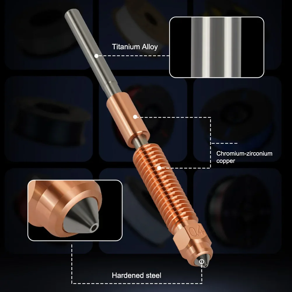 - 3. Material Upgrade: This high-speed printing nozzle combines a bimetal copper alloy and hardened steel, offering excellent thermal conductivity and hardness. Paired with a titanium alloy heat sink, it reduces thermal transfer, supporting various filament materials for superior print quality.