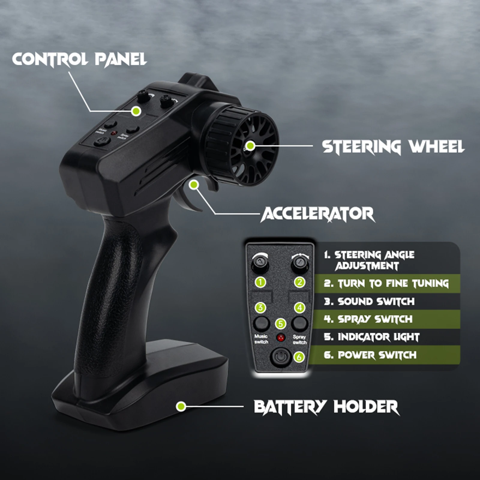 - Functions: Forward, backward, left turn, right turn, spray, music, differential, full-scale steering gear