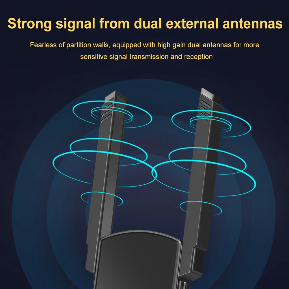 - Strong Signal and Efficient Cooling: Equipped with dual external antennas, this external wireless adapter provides a strong and stable signal for seamless internet connectivity. The side ventilation holes design effectively lowers the working temperature of the adapter, ensuring continuous high-performance networking.