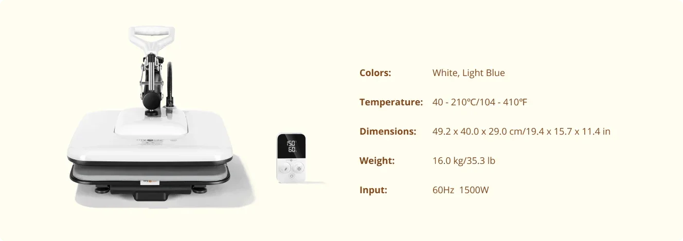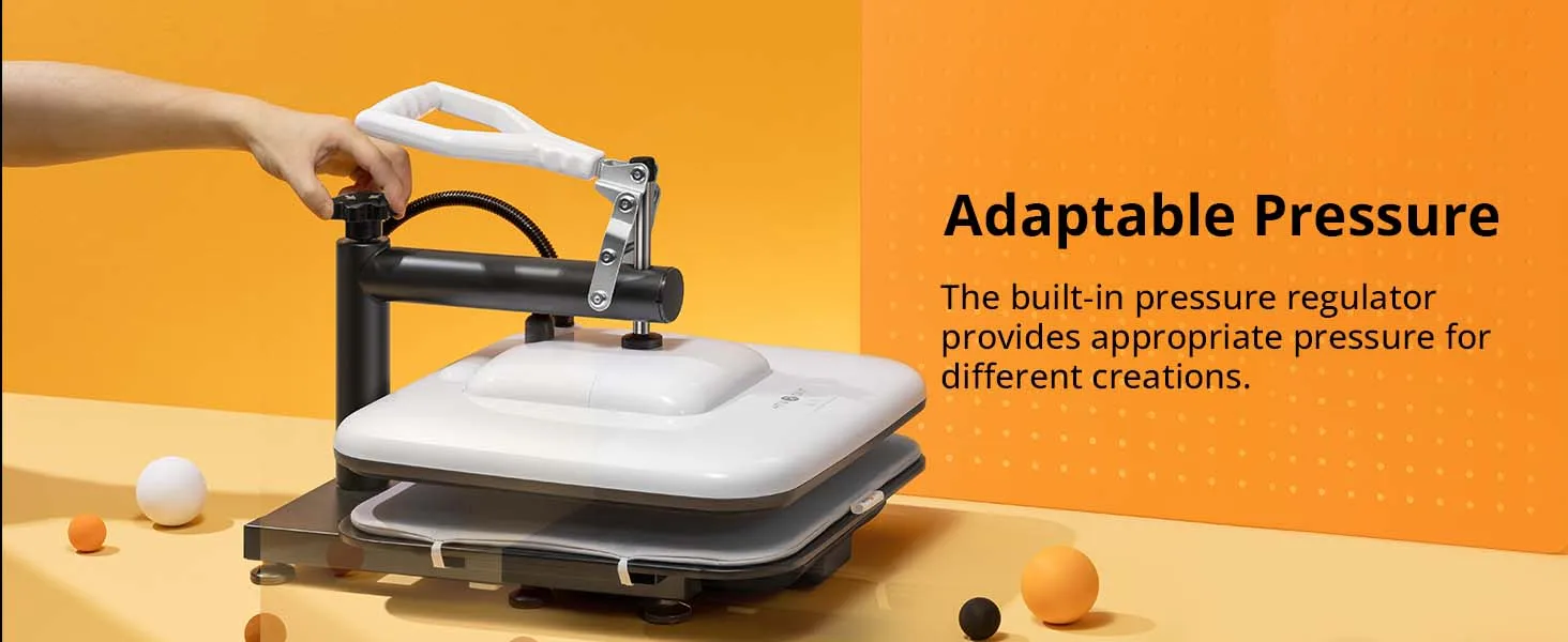- Swingable Plate and Adjustable Pressure: The 180° swing-away heat plate allows for easy design placement, reduces burn risks, and ensures precise transfer alignment. The adjustable pressure knob enables users to set the pressure according to the material thickness, ensuring a seamless fit between the heating plate and the object.