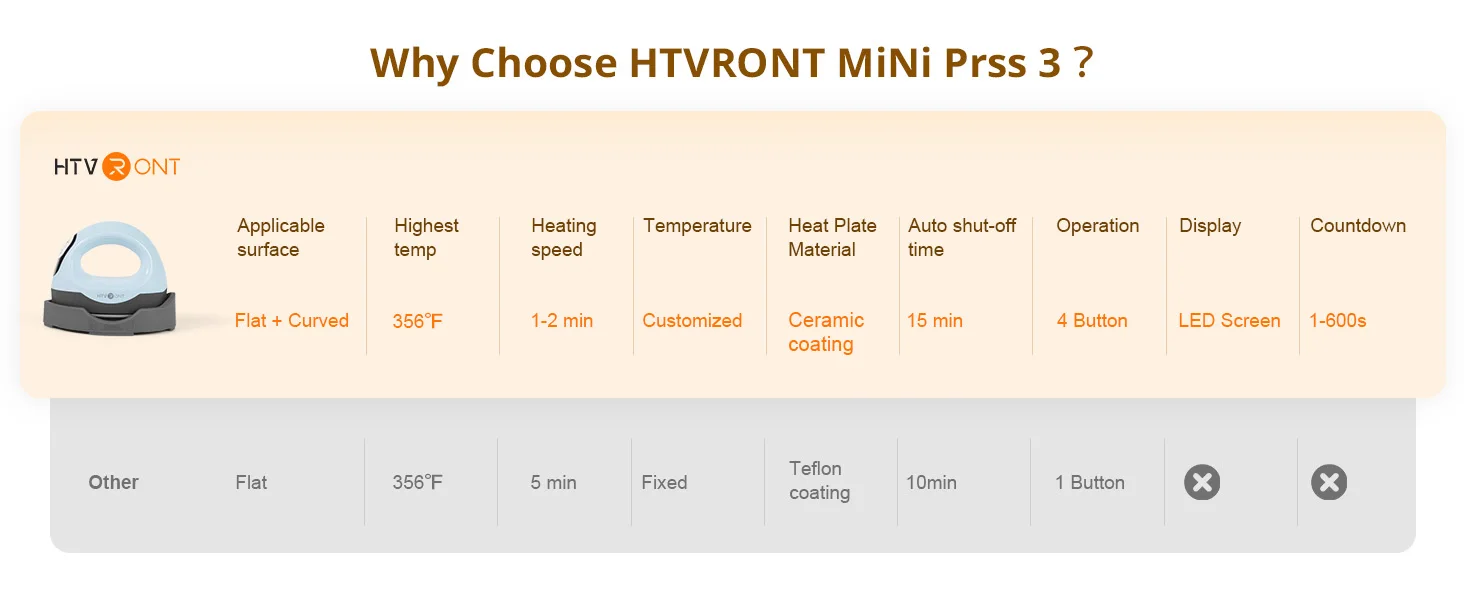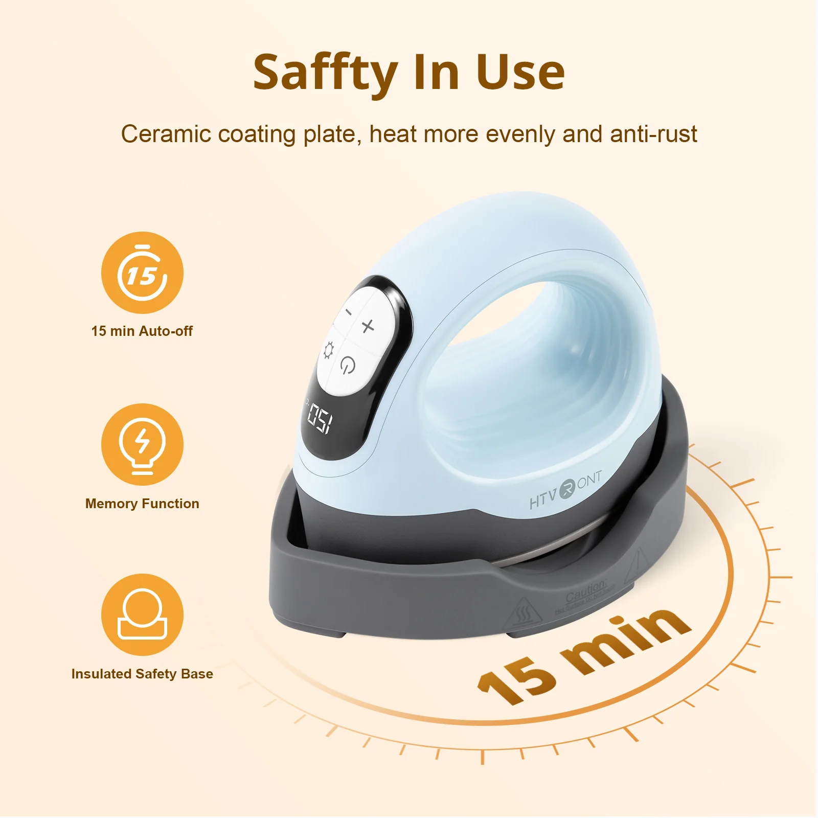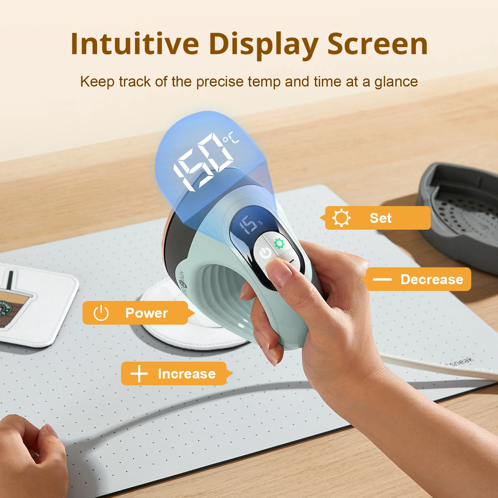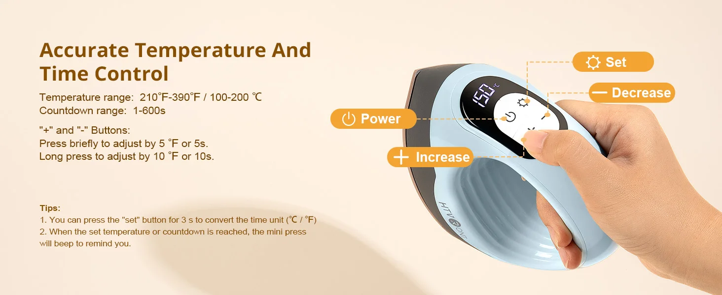 Added a display screen and four silicone buttons, which can adjust the desired temperature and time within the range of 100-200 ℃ and 1-600 seconds, and see the changes in temperature and time. At the same time, it has a pressing timer function, making ironing easy and convenient.