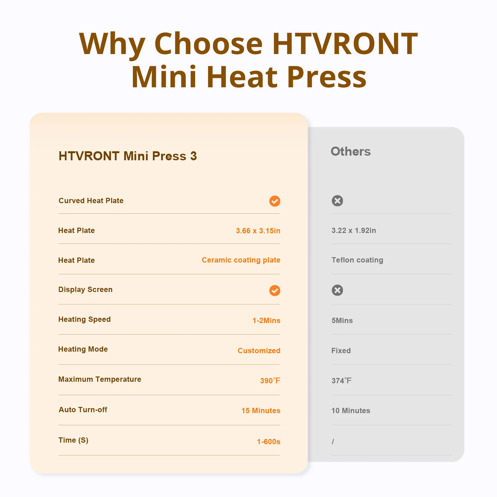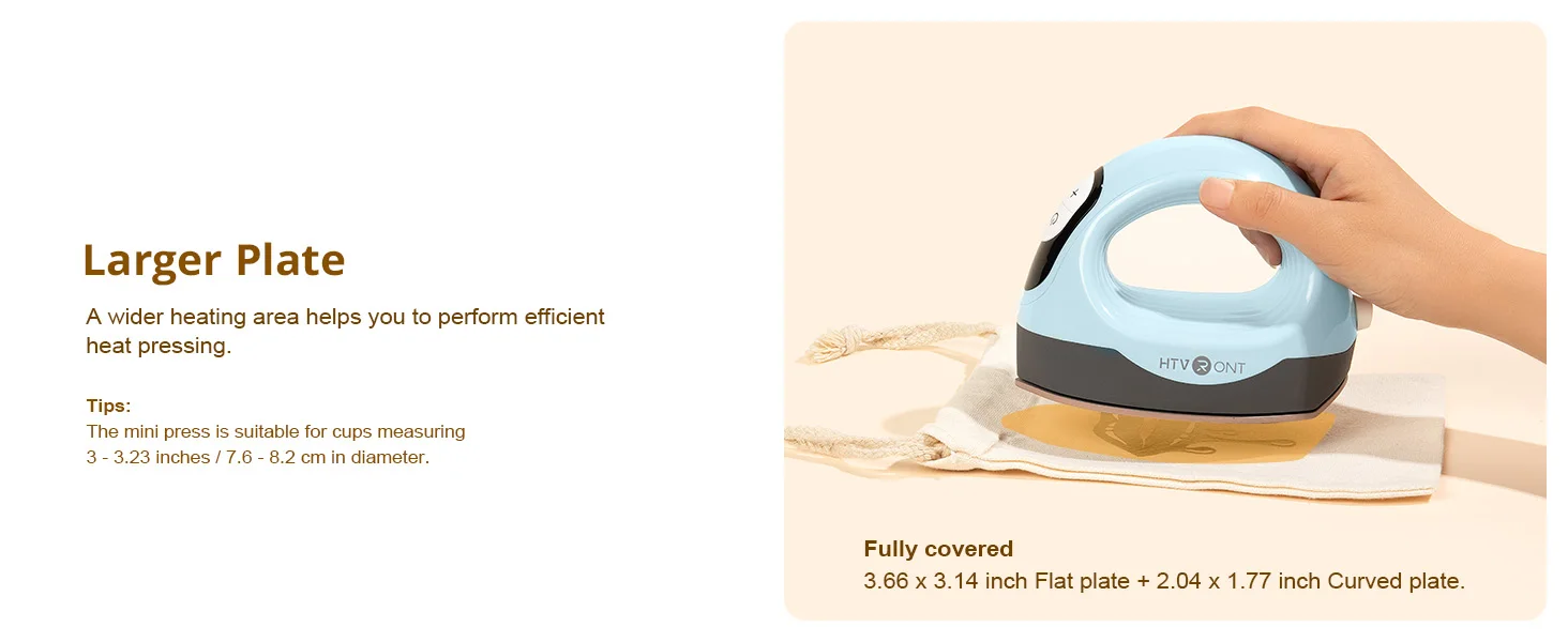 A flat heating plate measuring approximately 9.0 x 8.0 cm, with a larger heating area compared to other competitors of the same model, and even larger heating areas than our Mini1 and Mini2. The upgraded heating area can meet users’ larger flat heating needs, and even small hot press machines have large heating plates.