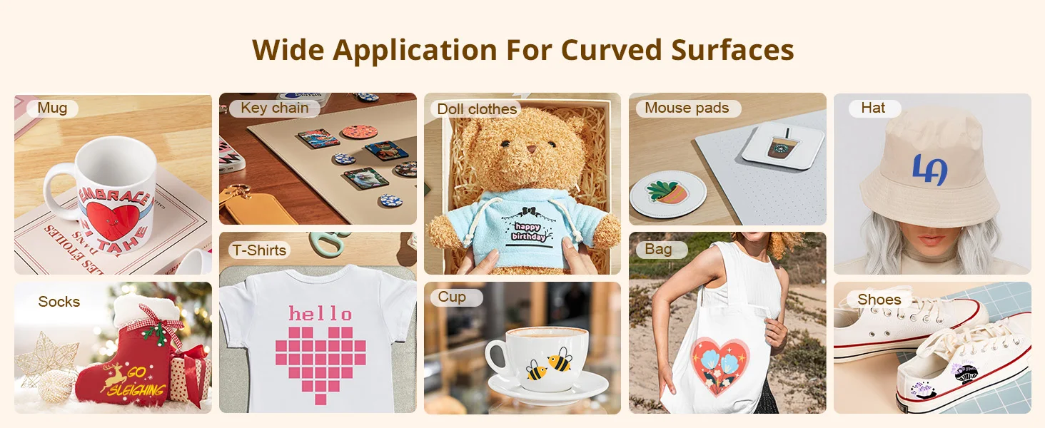 Can achieve small curved surface hot pressing scenarios, meeting the hot pressing needs of small curved surfaces such as cups, hats, heels, etc., suitable for consumables such as engraved film and sublimation paper.