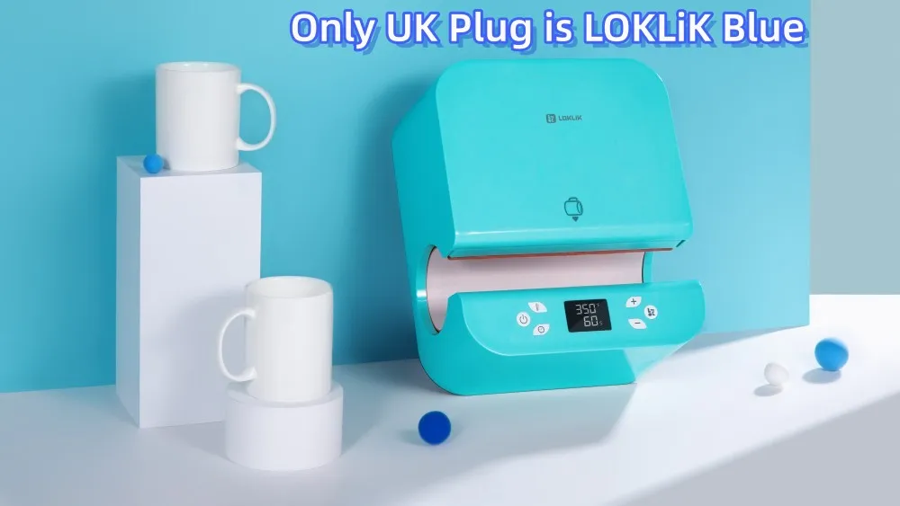 - The item is available only with US/UK/AU plug types. Please select the correct plug type before placing your order. If you have an adapter for EU/US/UK/AU plugs, it can work. Note that the UK plug mug heat press machine is the LOKLiK brand, and the blue color is LOKLiK blue, as shown below.
