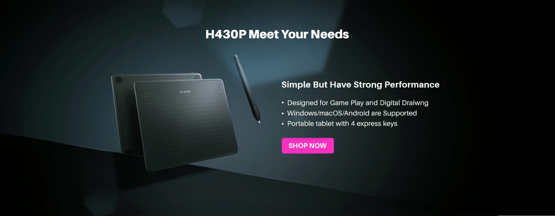 Lightweight and compact at about 135g and only 6.3mm thick, the H430P is easy to carry and fits cleanly into small workspaces. The 4.8 x 3-inch active area gives you a solid creative space without taking over your desk. Four express keys on the top can be programmed for shortcuts like Scroll, Undo, and Eraser to help you work faster and more smoothly.