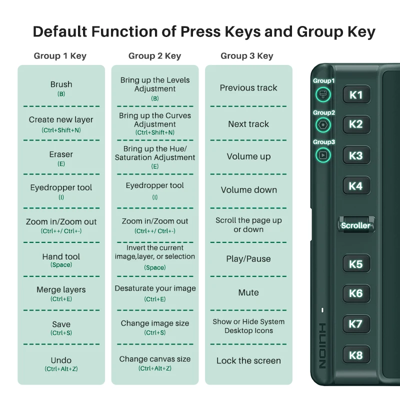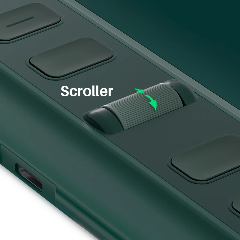 The press keys are easier to find and use thanks to the raised bar height (2mm higher than the drawing surface), the color contrast between keys and bar, and the bumps on each press key. Inspiroy 2 also includes a handy Scroller that works like a mouse scroll wheel, and its sensitivity can be adjusted in the driver.
