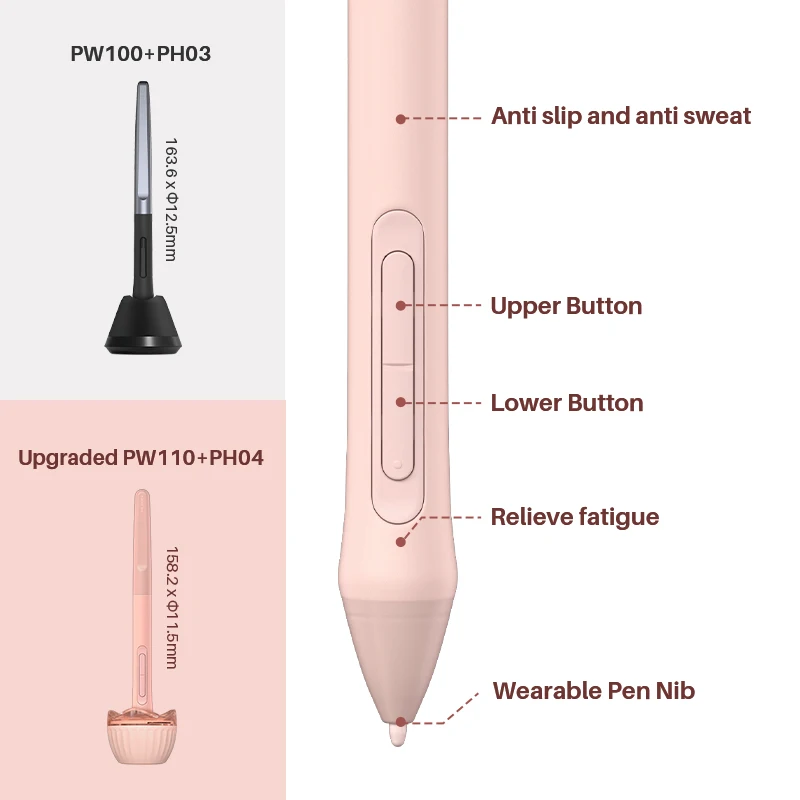 Inspiroy 2 comes with the battery-free pen PW110, which is thinner than PW517. It features an extended silicone grip and recessed programmable buttons to help prevent accidental presses. You still get stable drawing performance with a shorter retraction distance and 8192 levels of pressure sensitivity. An ergonomic pen holder is included as well.