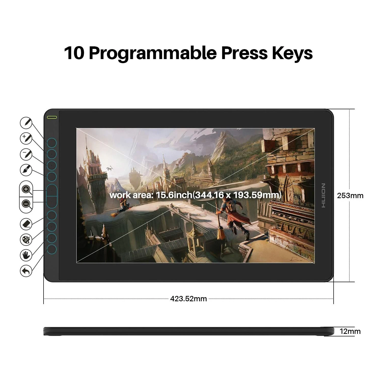 With the 12mm thickness and the 1.26Kg weightiness, you can put Kamvas 16 2021 in a backpack and carry it with you. The 10 programmable press keys are ergonomically designed to facilitate your operation. The user-friendly design makes Kamvas 16 the ideal supply for online teaching/learning and remote work.