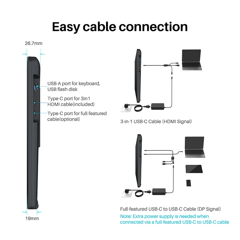 A full-featured USB-C cable can connect supported Android devices for data, power, and signal transmission through one cable. If your PC or laptop cannot provide enough power, you can plug in the power cable from the 3-in-1 cable to assist.