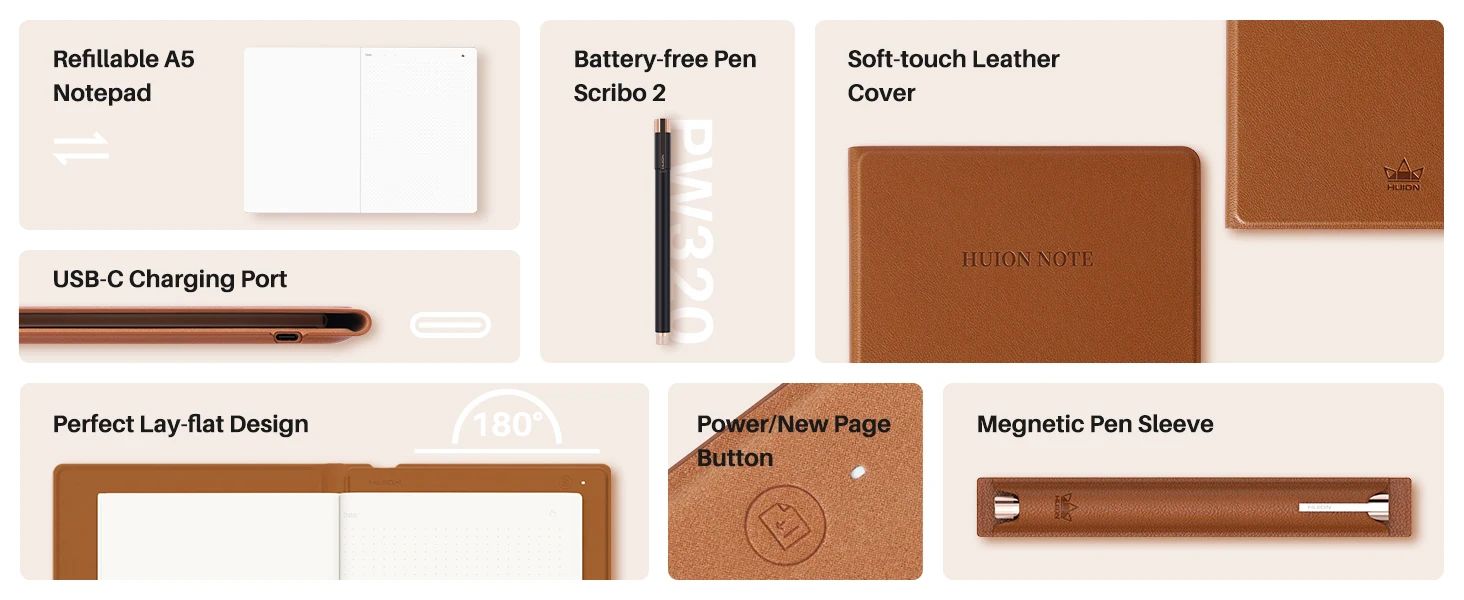 Huion Note reimagines the modern notebook with writing sync, offline storage, document management, and one-click PDF sharing in a portable A5 form factor.