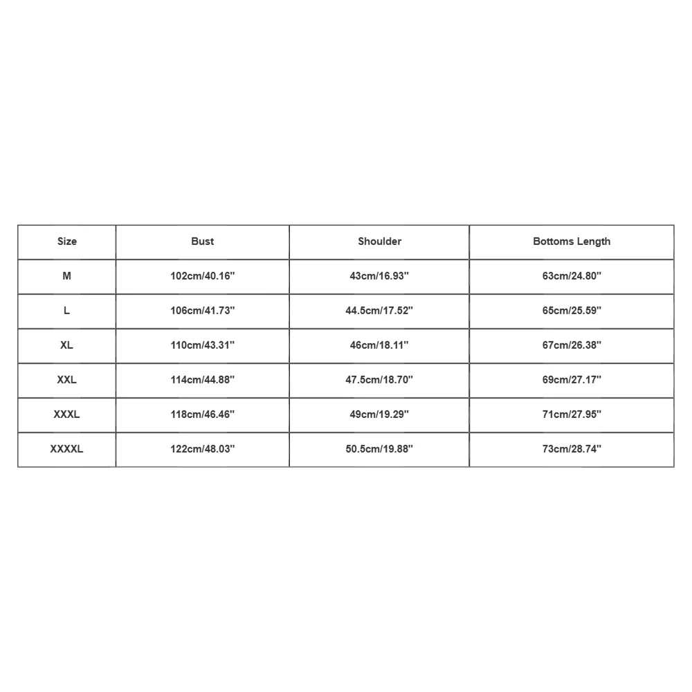Size XXXXL – Bust: 122cm (48.03″), Shoulder: 50.5cm (19.88″), Bottom Length: 73cm (28.74″)