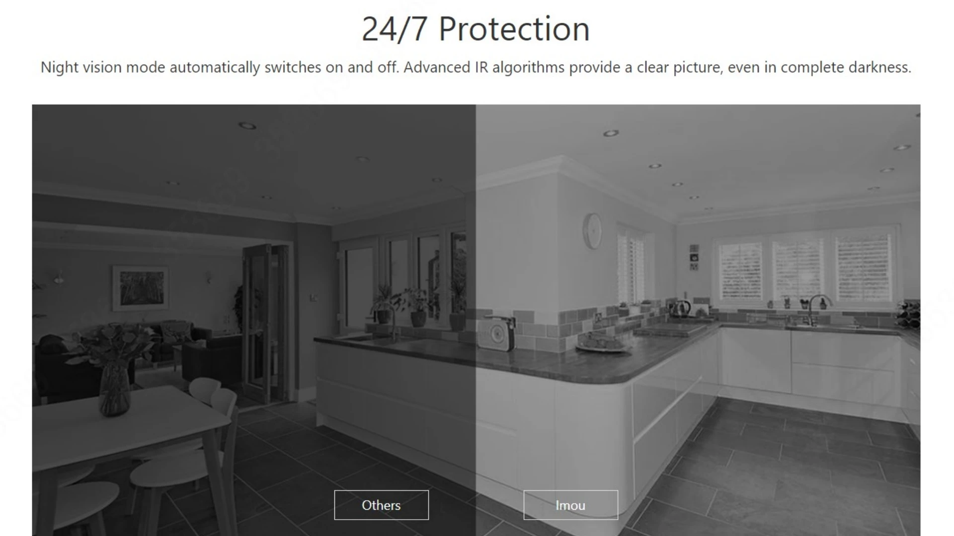 Night vision mode automatically switches on and off. Advanced IR algorithms provide a clear picture, even in complete darkness.