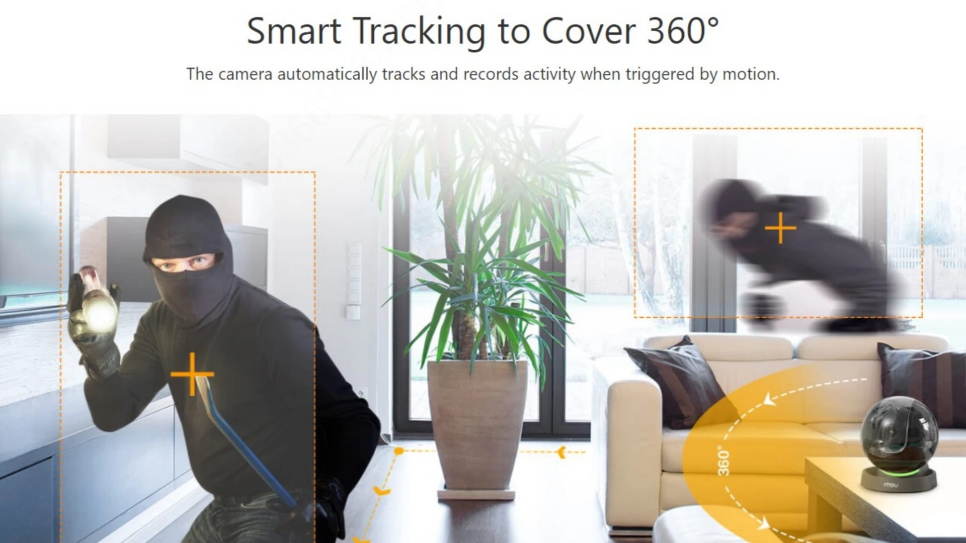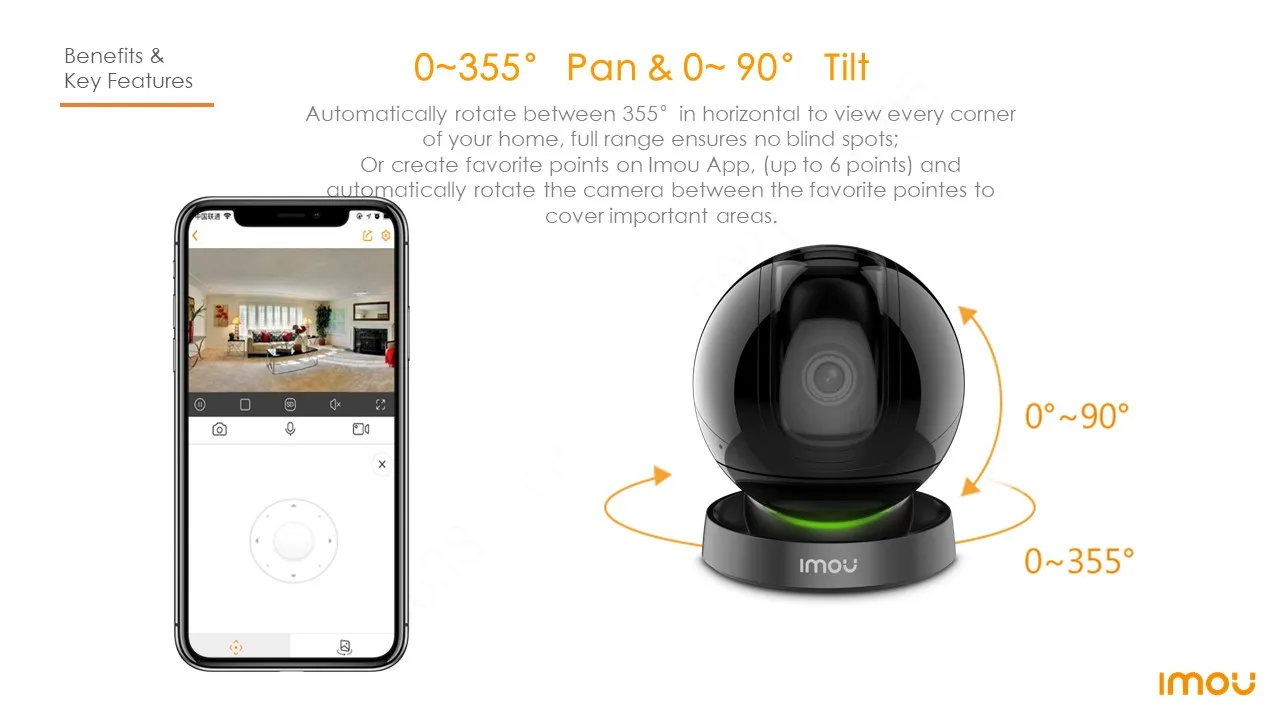 Automatically rotate between 355°in horizontal to view every corner of your home, full range ensures no blind spots; Or create favorite points on Imou App, (up to 6 points) and automatically rotate the camera between the favorite pointes to cover important areas.
