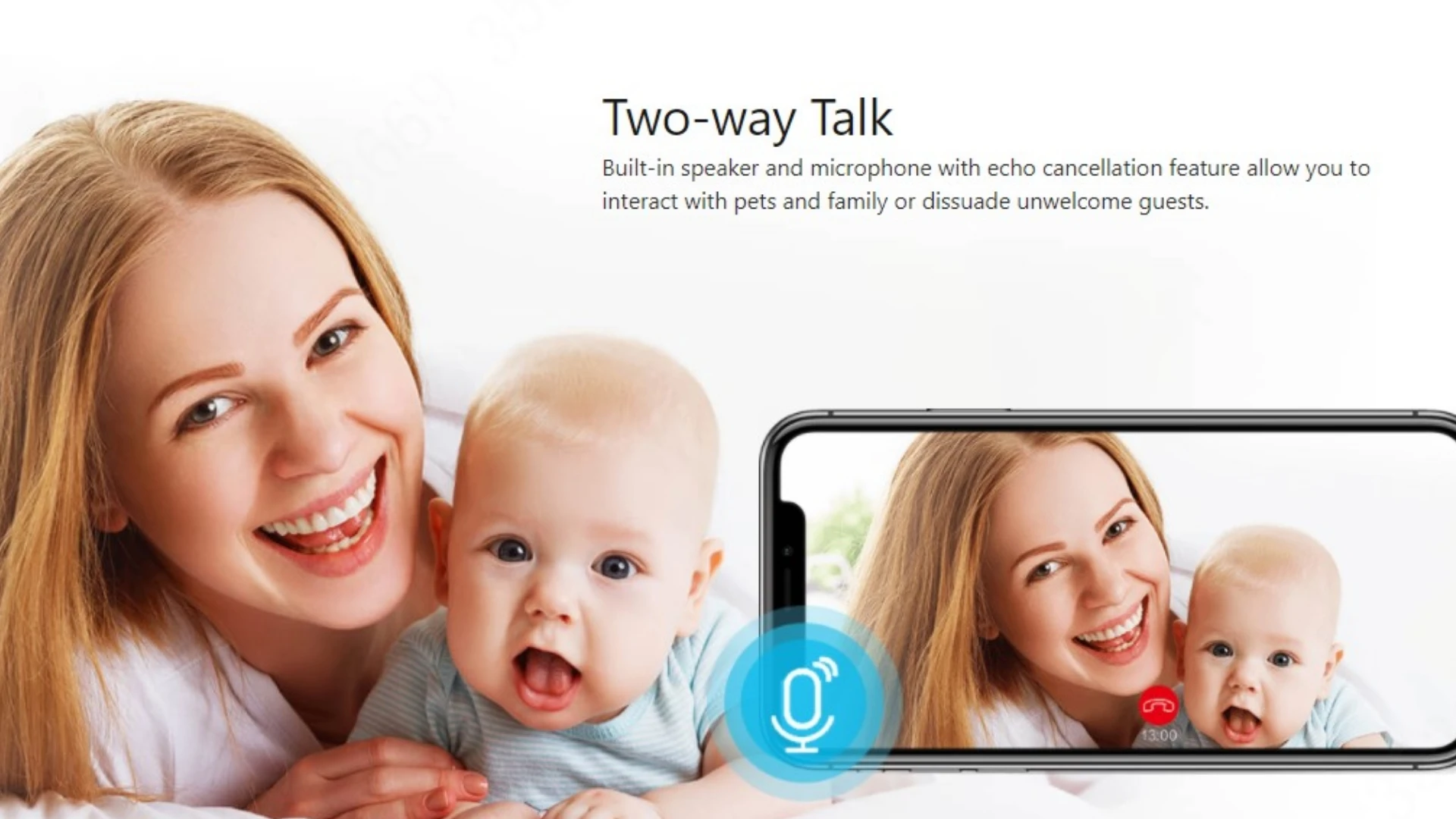 Built-in speaker and microphone with echo cancellation feature allow you to interact with pets and family or dissuade unwelcome guests.