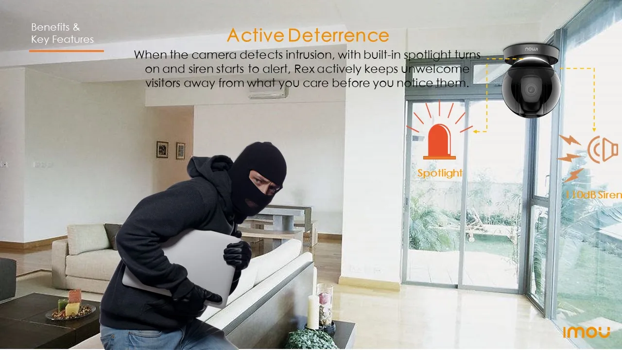 When the camera detects intrusion, with built-in spotlight turns on and siren starts to alert. Rex activetly keeps unwelcome visitors away from what you care before you notice them.