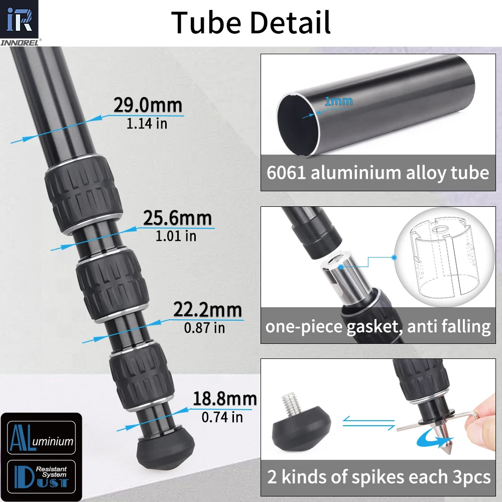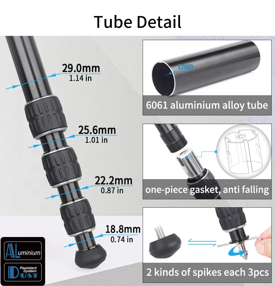- Premium build: The camera tripod is made of aluminum alloy with CNC machining and anodic oxidation for a smooth, even finish. The maximum tube diameter is 29 mm for excellent stability, and it supports up to 20 kg.