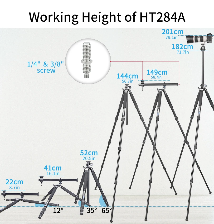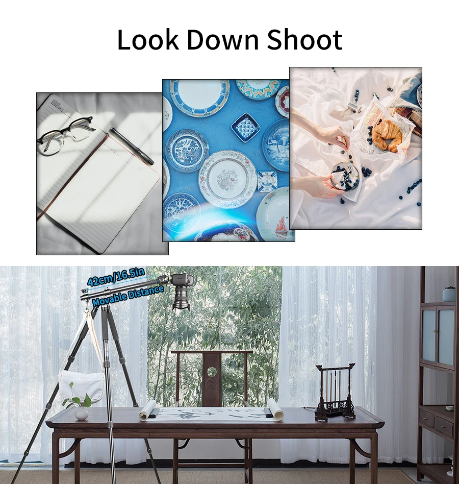 - Multi-angle shooting: Tripod legs have three angle settings (12°, 35°, 65°). The center column adjusts up to 210° vertically and 360° horizontally for low-angle and macro shots.