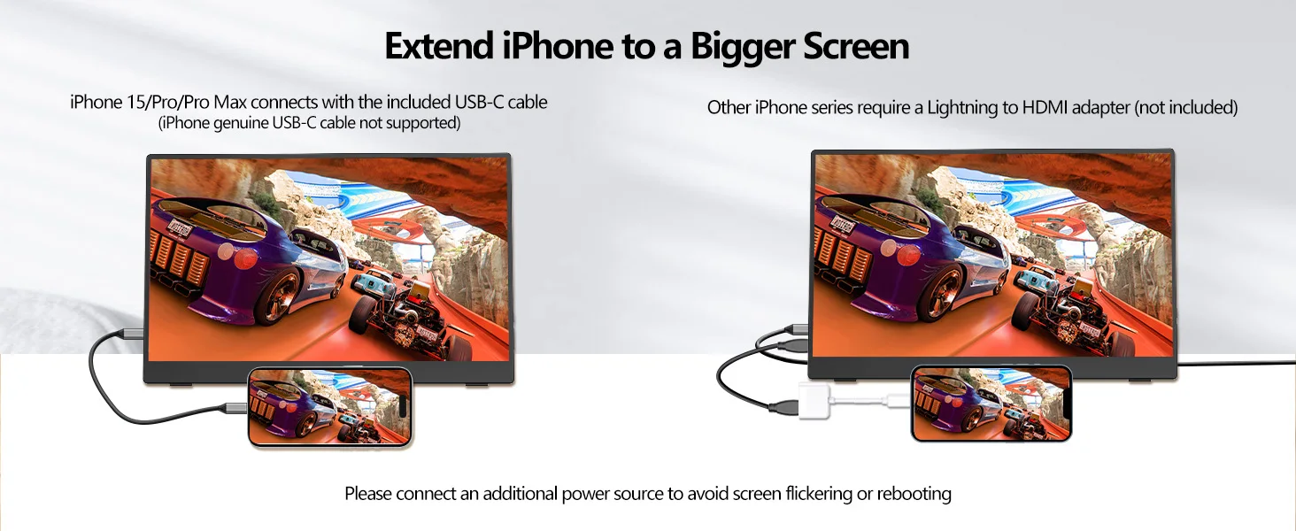 FHD Monitor Portable – The 15.6-inch 1080P portable laptop monitor features a high-quality IPS A+ screen with a 178° viewing angle. It offers a contrast ratio of 1200:1, providing richer color depth and better image quality compared to standard 1000:1 monitors. Combined with HDR technology, it delivers lifelike colors and enhanced clarity for both work and gaming.
