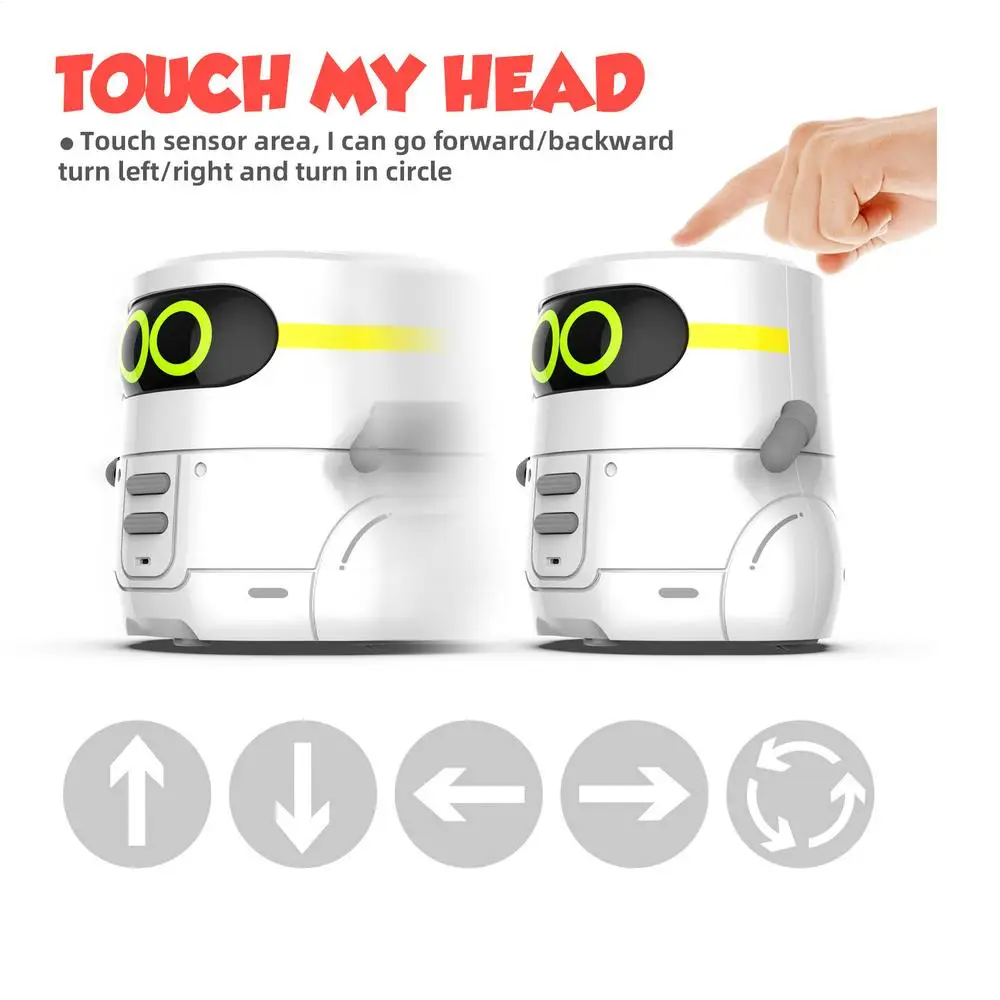 - Touch Sensing Mode: Three touch points (front, left, right on top of the head). Touching the left or right controls moves and volume. Touching the front triggers various actions and sounds.