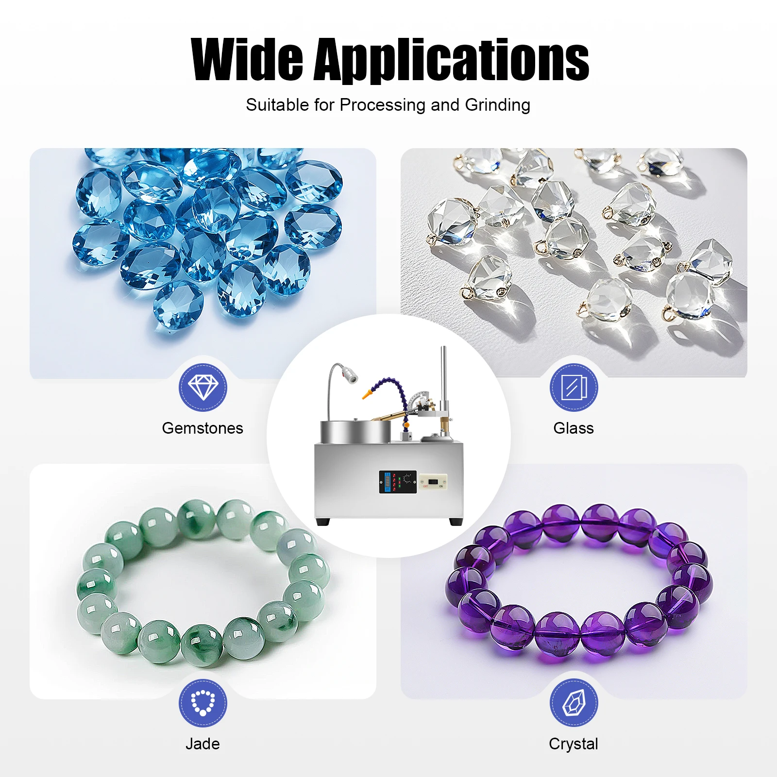 This machine is suitable for processing and grinding tools, seals, natural gemstones, semi-precious stones, glass, jade, crystal, agate, garnet, and olivine for interfaces and cutting surfaces.
