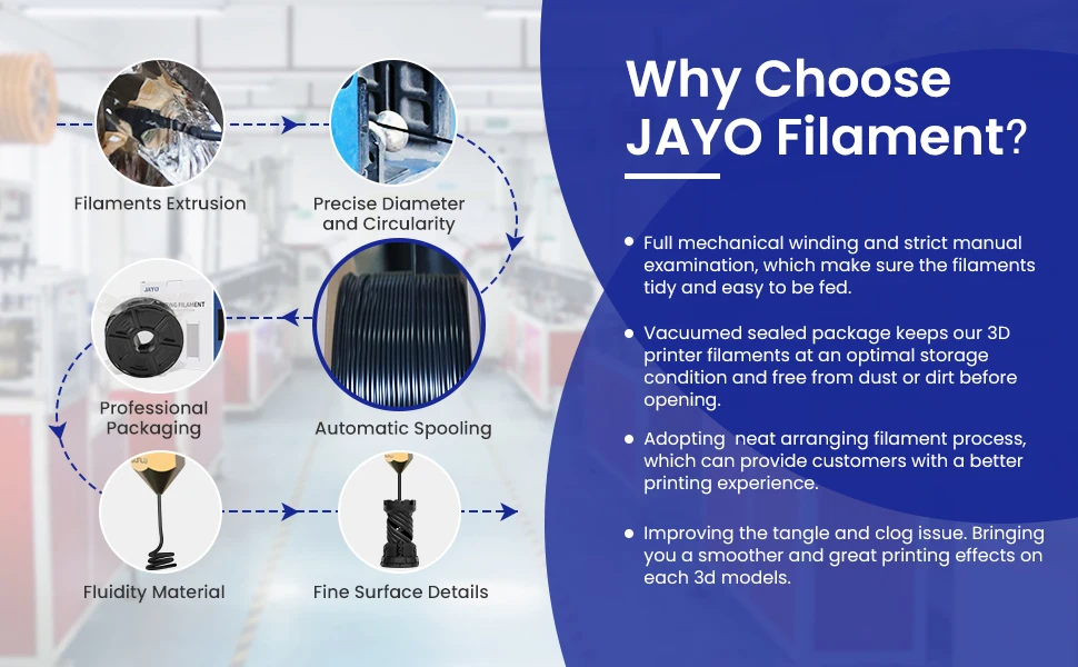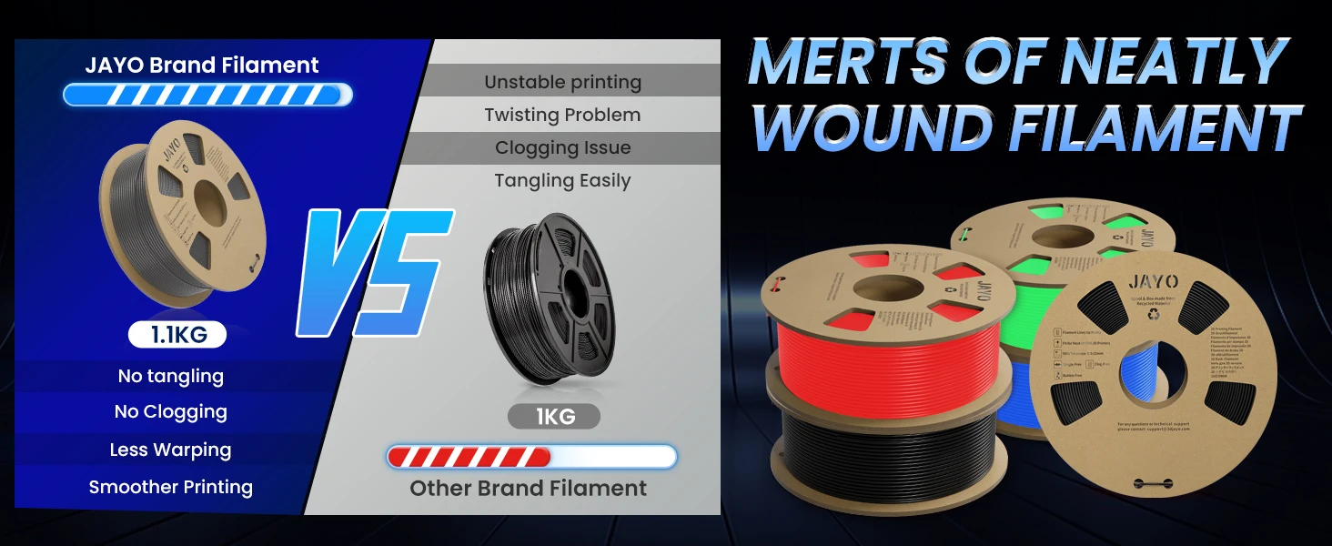 - Super Neat Filament Spool: JAYO 3D printer filament product line is equipped with an excellent self-developed neat winding device, ensuring a 100% neat rate with no clogs, making the filament easier to use.