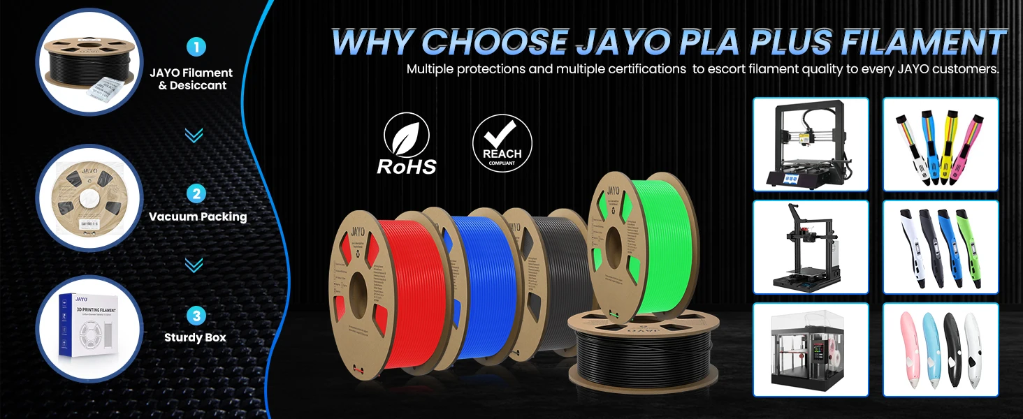 - Strong Compatibility: JAYO 3D Filament applies not only to all JAYO 3D printing products: FDM 3D Printer, 3D Printer Accessories, Filament Dryer, but also to almost all FDM 3D printers of other brands, for example: Ender 3/Ender 3V2, etc.
