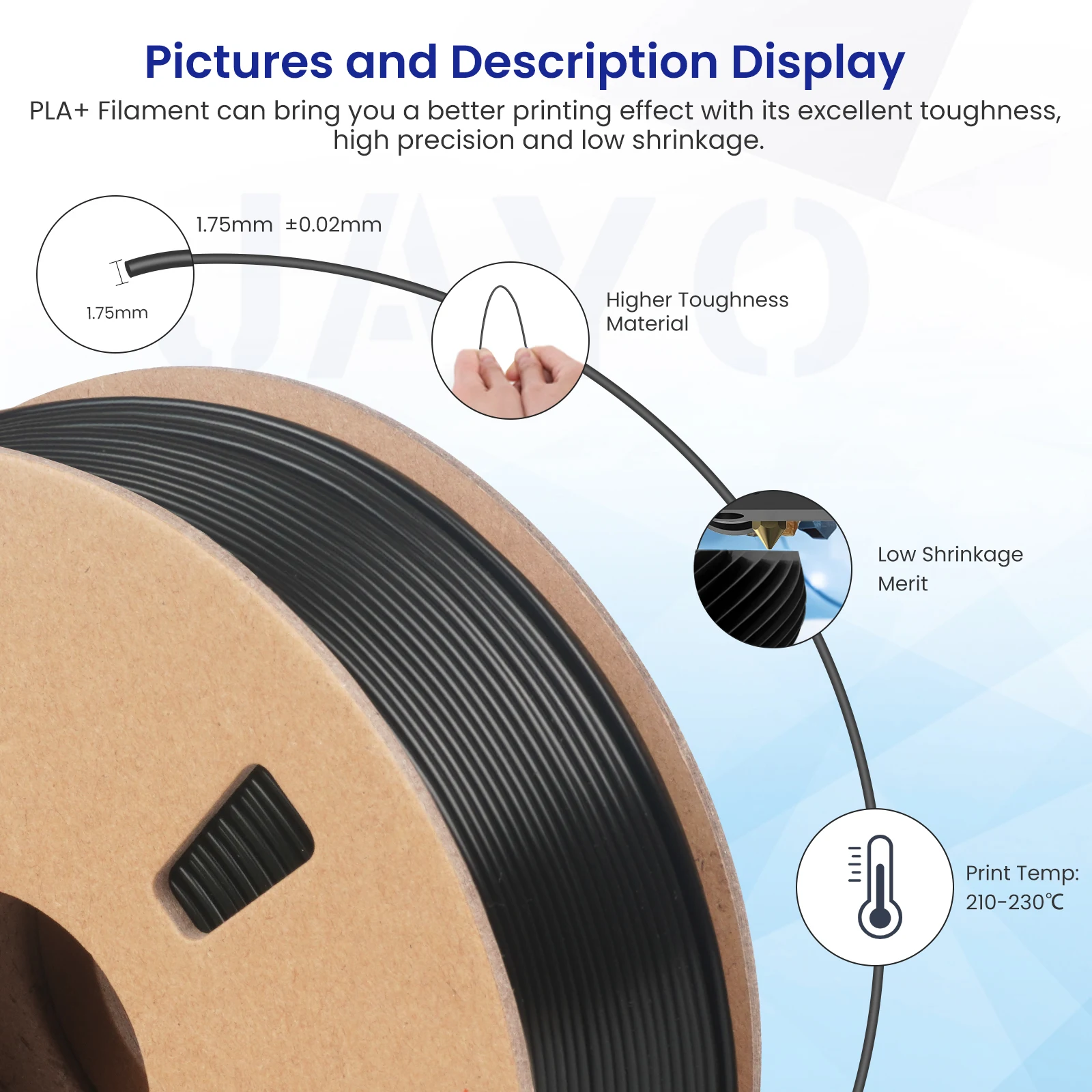 - High-Speed PLA Printing Tips: The average printing temperature of JAYO High Speed PLA filament is lower than regular PLA filament, saving time and energy consumption. As HS PLA Filament is temperature-sensitive, please set slicing parameters according to the recommended print speed and temperature matching based on your 3D printer. If stringing occurs, please reduce print temperature appropriately.