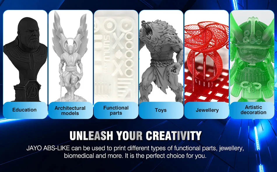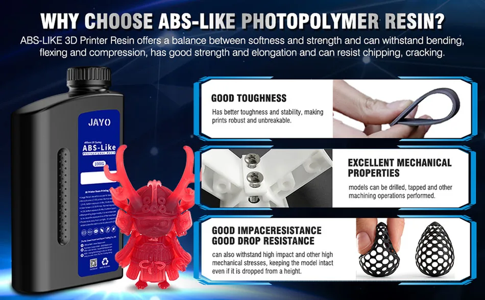 Compared to other types of 3D Printer Resin, JAYO ABS-Like Photopolymer Resin offers better toughness, is non-brittle, and has excellent abrasion resistance. If you need to print miniature or tiny objects, JAYO ABS-Like 3D Printer Resin is your first choice.