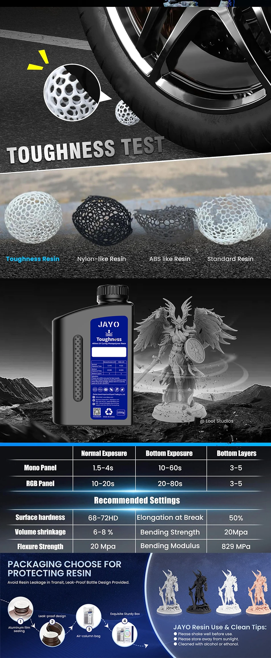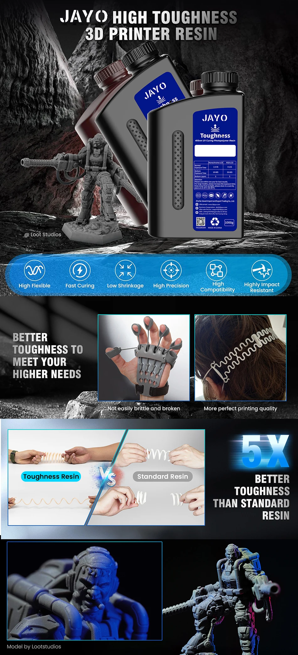 High toughness for Better Performance: JAYO high toughness 3D resin has long-lasting toughness and elongation 5 times higher than regular standard resin. It offers excellent flexibility and bendability, making your 3D printed models unbreakable and durable, improving 3D printing quality. It’s very suitable for printing high-toughness models, such as structural parts and solid models.