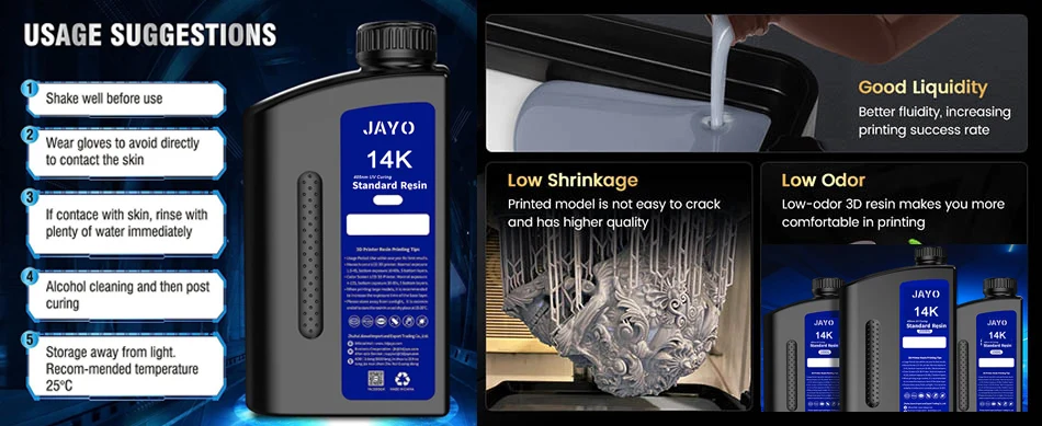 Low Odor 405UV Photopolymer Resin: After testing, JAYO high-toughness 3D resin has a lower printing odor compared to other 3D resins on the market, providing 3D resin users with a more comfortable printing environment. JAYO high-toughness 3D resin is also easy to use and can be easily cleaned from the print model with alcohol or ethanol.