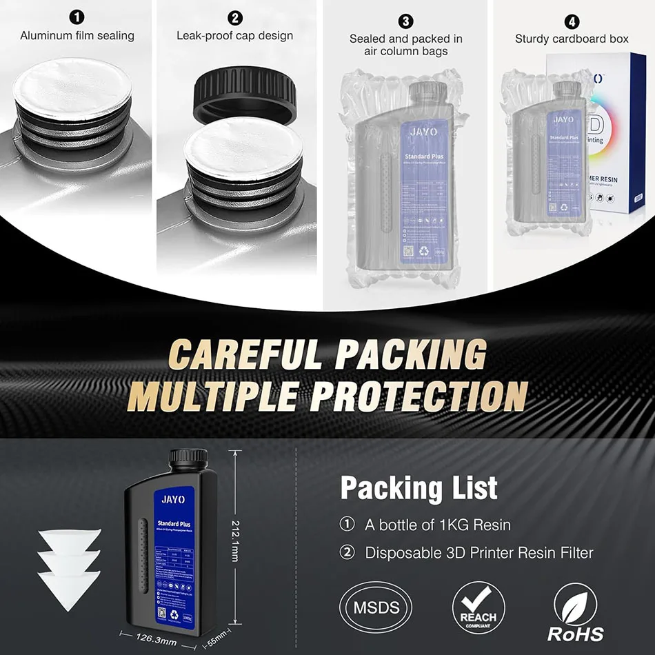 JAYO Standard Plus 3D Printer Resin has an upgraded formula from the regular standard resin, providing better performance in terms of higher precision, stronger toughness, and longer shelf life.
