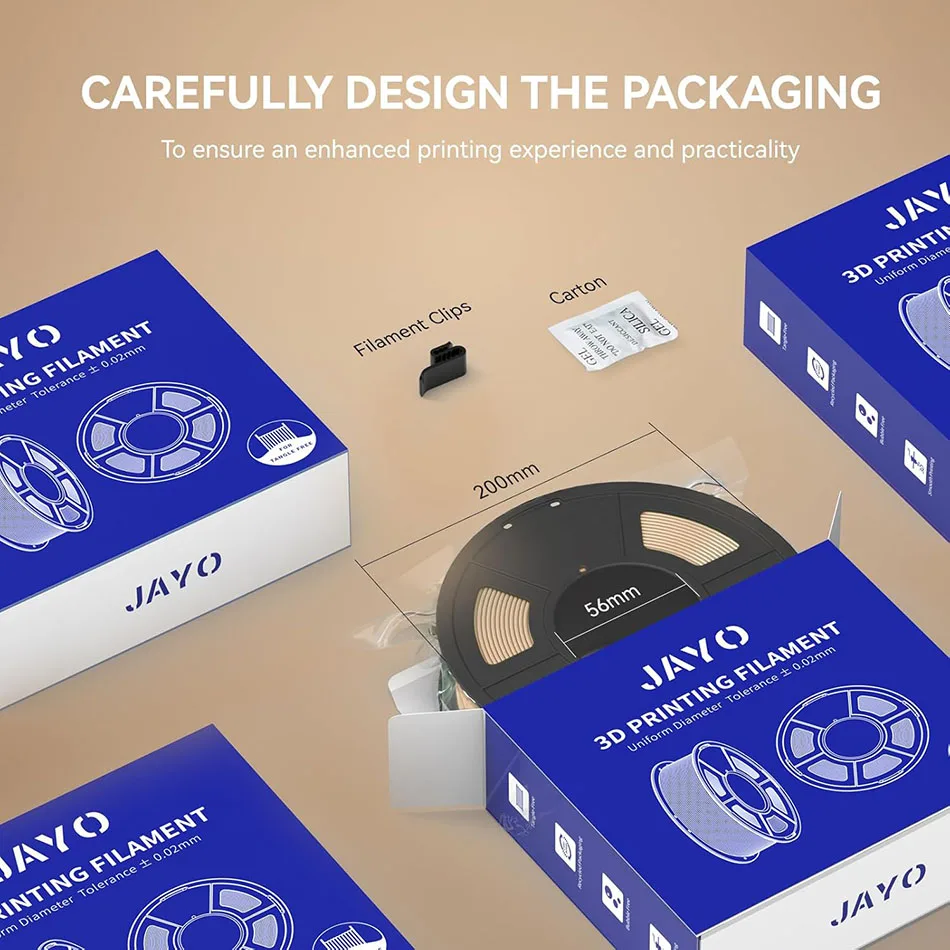 Engineered with a ±0.02 mm tolerance, JAYO PLA wood filament ensures smooth feeding and extrusion, preventing clogs. Each roll is dried for 24 hours and vacuum-sealed for superior performance.