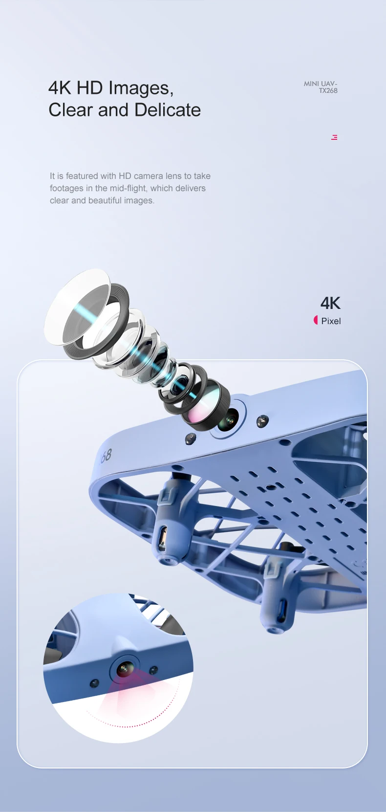 - 4K Camera: 4k images (4096×2160), 1080P video (2048×1080). Real-time transmission to a mobile phone via APP.