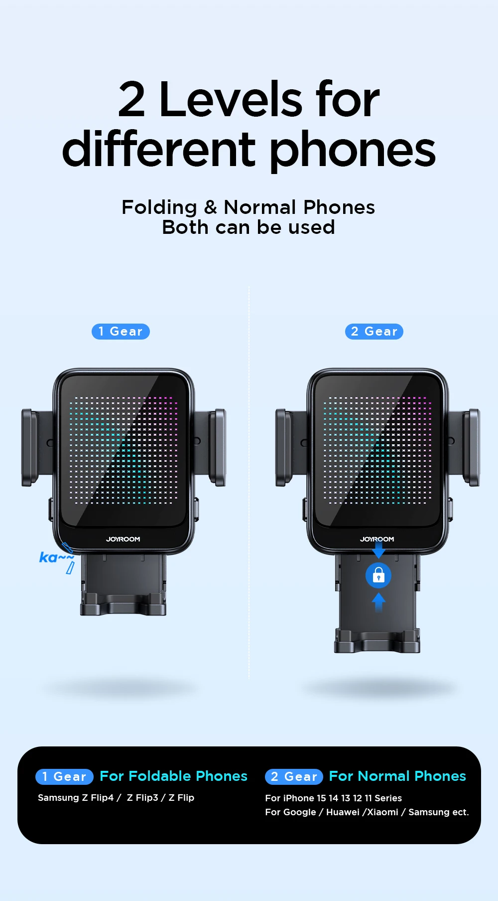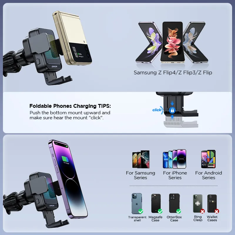 Adjustable Bottom Bracket for Different Phone Types: The bottom bracket of the charger has two adjustable gears to cater to different phone types. For folded phones, push the bottom bracket up firmly. For non-folded phones, pull the bottom bracket down loosely. This feature ensures a secure fit for various phone sizes and types.