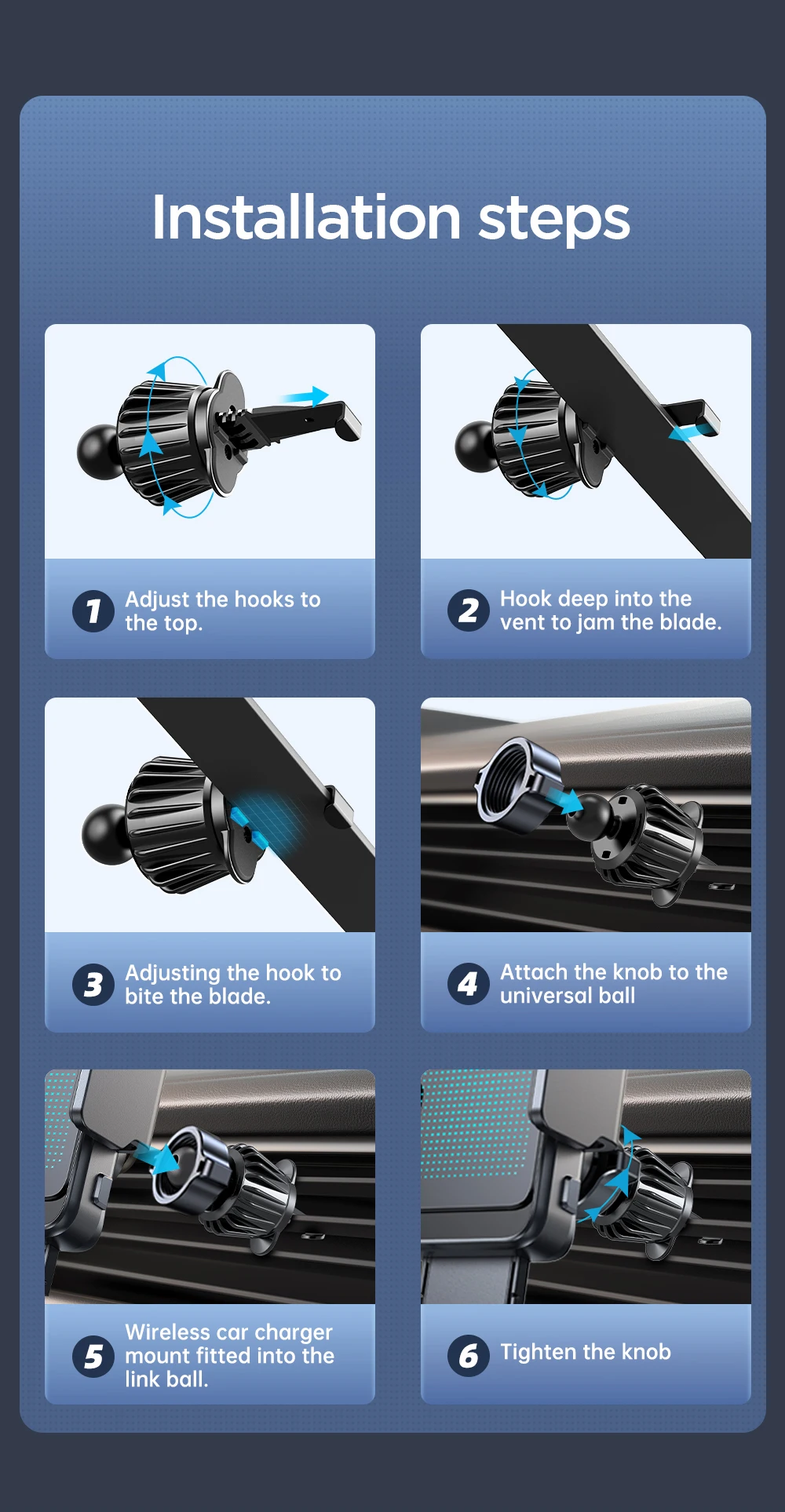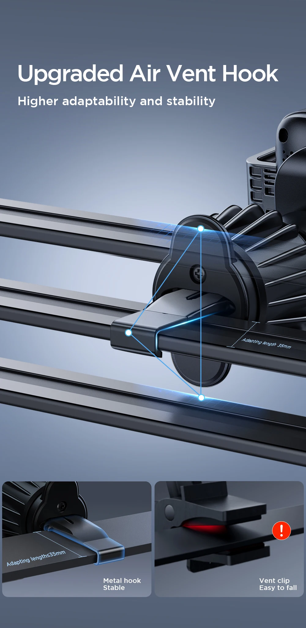 Durable Vent Hook Material: The vent hooks of the charger are now made with metal, enhancing their durability. They are designed to hook onto the outer blades of the vent and rotate to lock, ensuring compatibility with 99% of vertical and horizontal vents. However, it’s important to note that round vents are not suitable for this design.