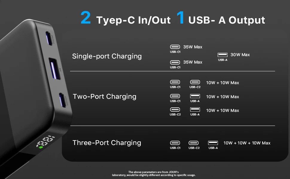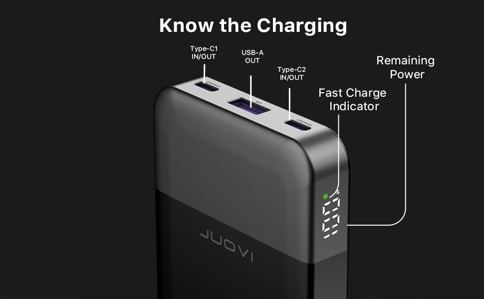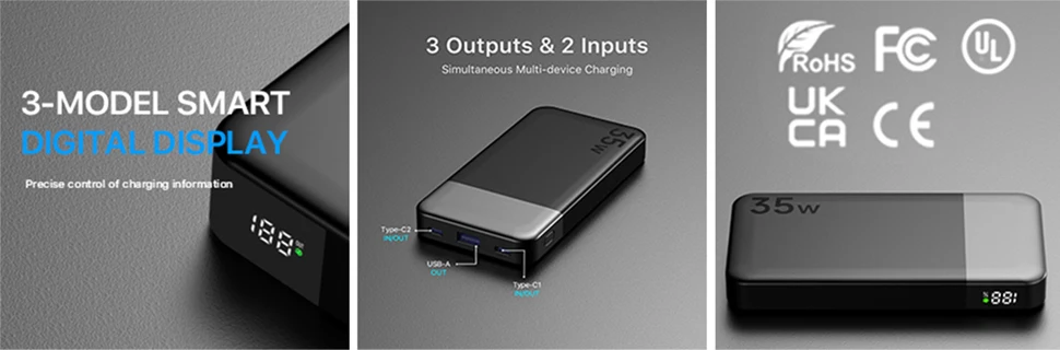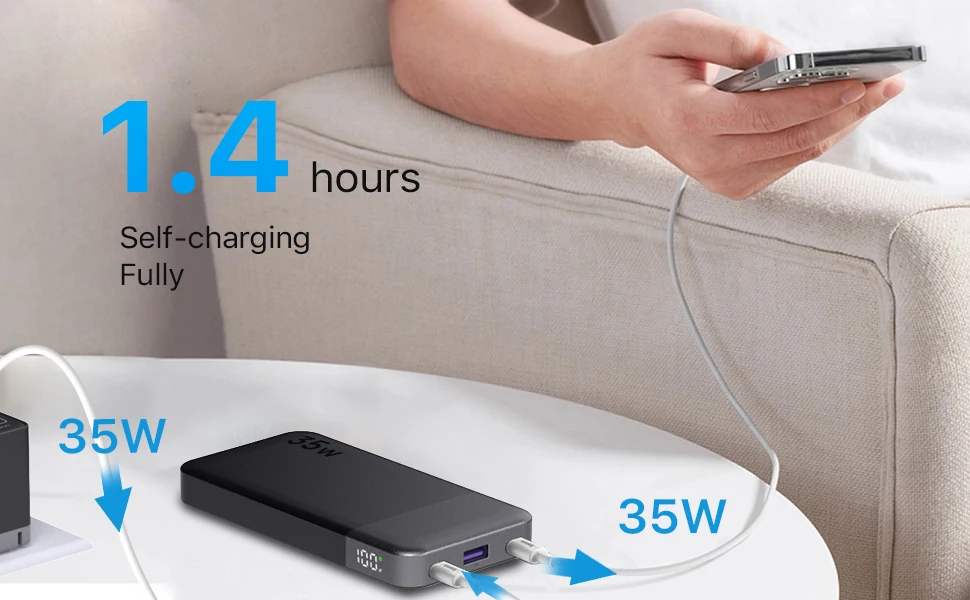 - Two-Way Fast Charging: Features a 35W PD Type-C port that works as both an input and output for added convenience. The power bank itself can be fully recharged in about 1.4 hours.
