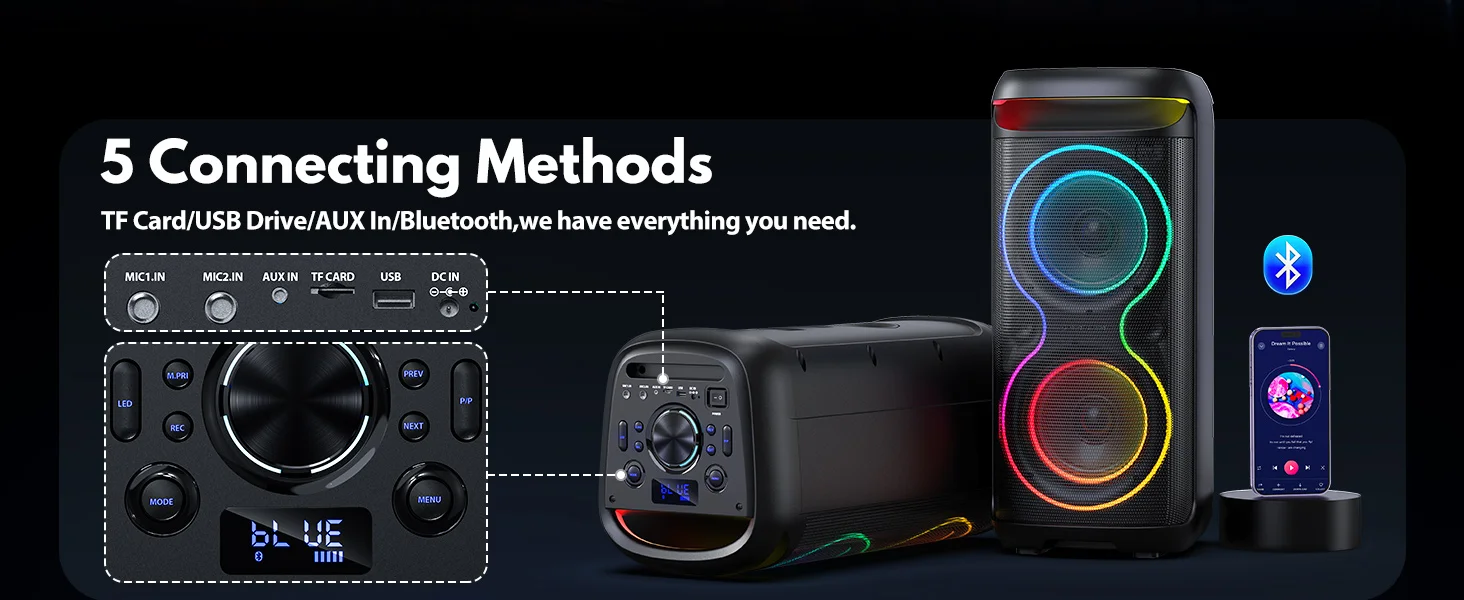 - Dazzling RGB LED Lighting: Electrify the atmosphere with dynamic, colorful RGB LED light rings around the speakers that pulsate and dance to the rhythm of your music. Create a captivating visual spectacle that energizes your party and enhances the festive mood.