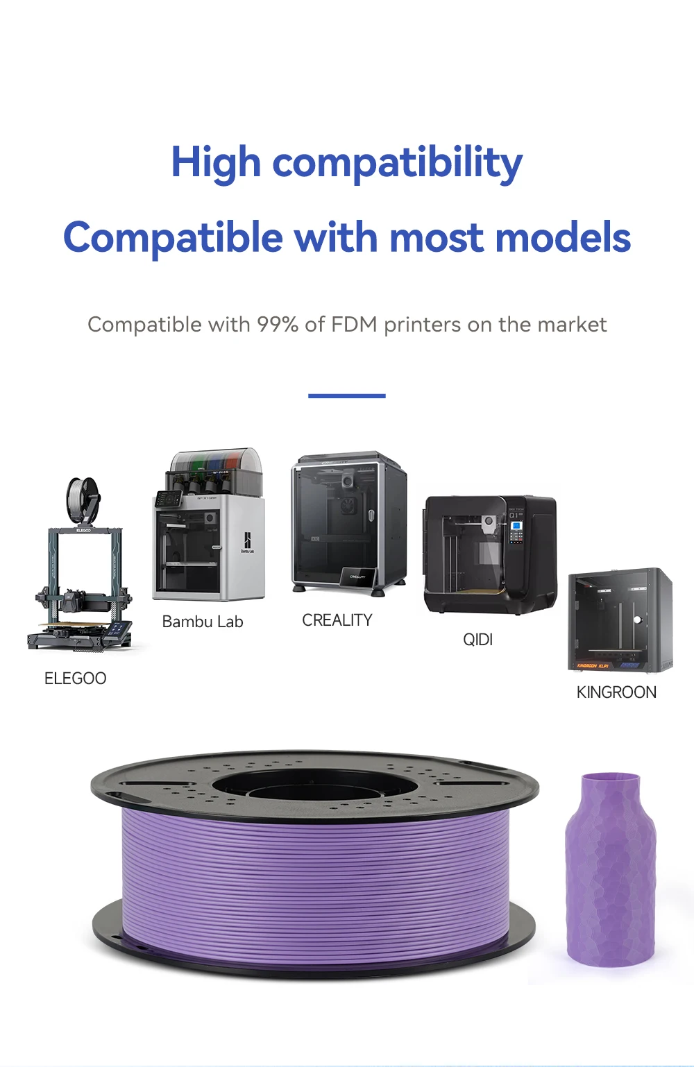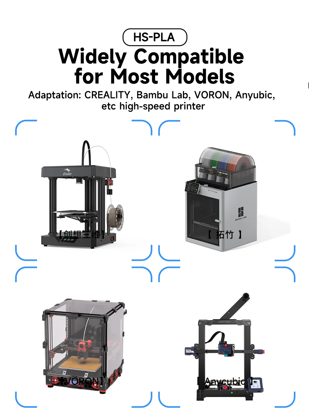 HS-PLA is the latest printing filament for high-speed 3D printers. By adjusting the melting point/index and glass transition temperature of raw materials, and optimizing the production process, HS-PLA offers stronger fluidity, smoother discharge, faster curing and forming speed, and is less prone to deformation under melting conditions.