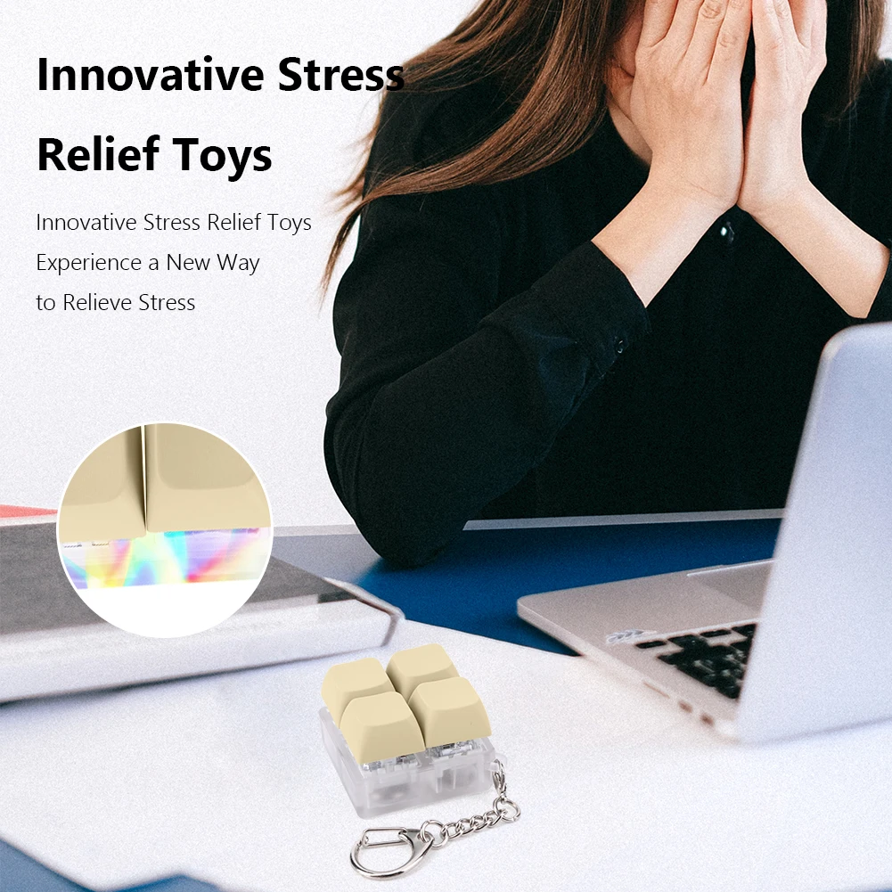 1. Innovative Stress Relief: Experience a new way to relieve stress with the keyboard fidget keychain decompression toys. Featuring four clickable buttons with LED multicolor lights that activate upon pressing, this toy offers a unique and entertaining method to alleviate anxiety and enhance focus.