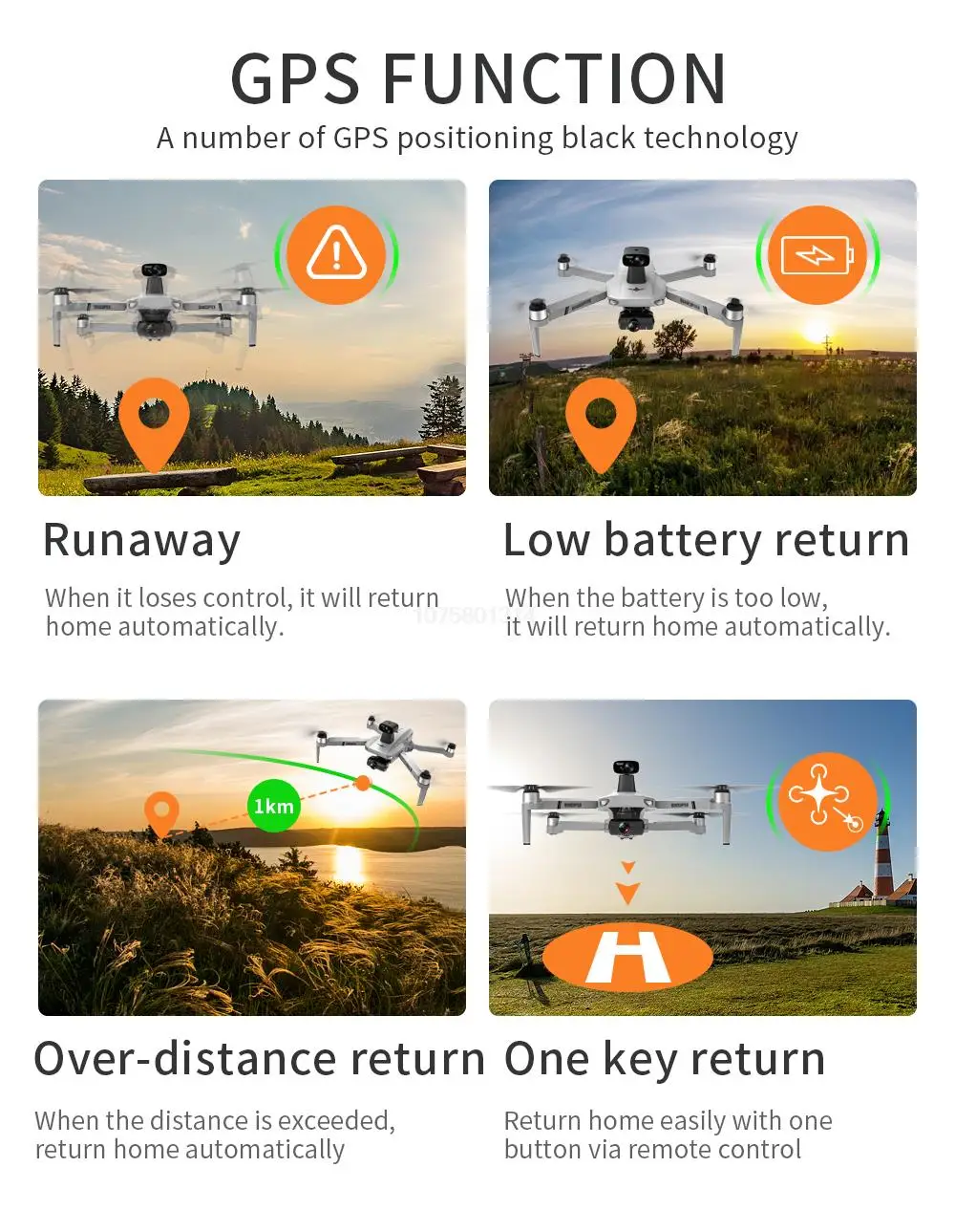 - GPS-Assisted Return: It automatically returns to the starting point when power is low or the signal is lost.