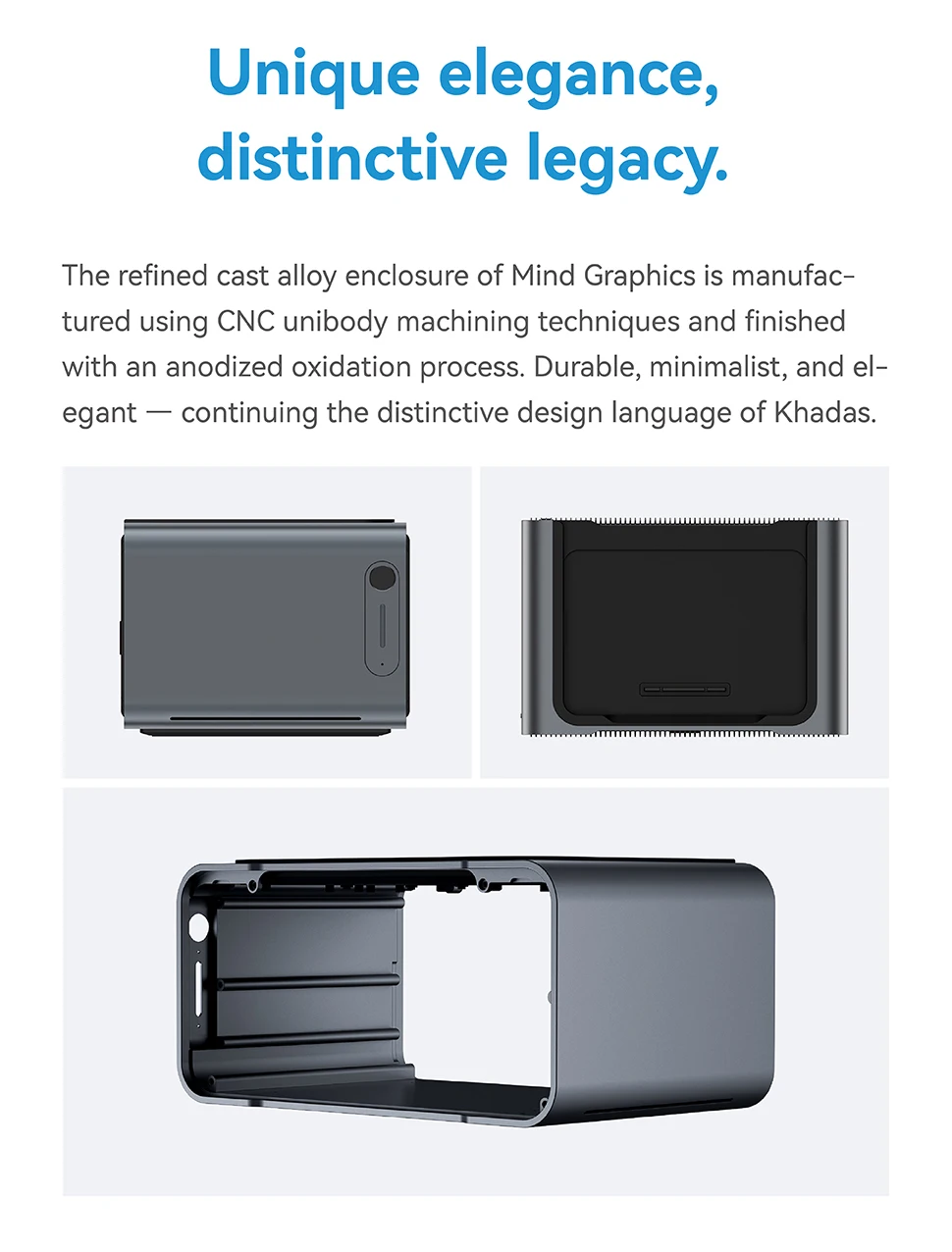 The refined Al-Si-Cu cast alloy enclosure is CNC-machined and finished with an anodized process for a durable, minimalist, and elegant look.