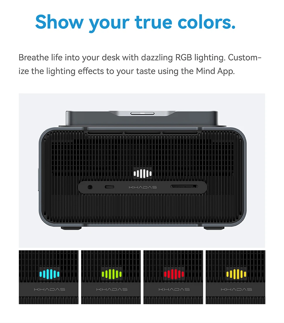 Add personality to your desk with customizable RGB lighting using the Mind App.