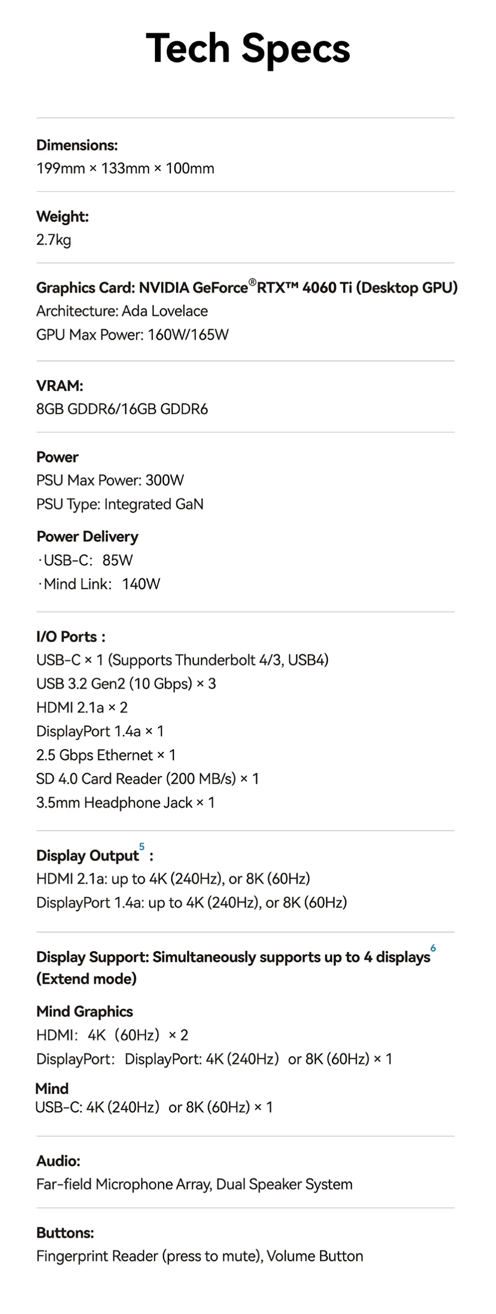- I/O Ports: 1 × USB-C (USB4/Thunderbolt 4/Thunderbolt 3), 3 × USB-A 3.2 Gen 2 (10 Gbps), 2 × HDMI 2.1a (up to 4K240 or 8K60), 1 × DisplayPort 1.4a (up to 4K240 or 8K60), 1 × 2.5 Gbps Ethernet, 1 × SD Card 4.0 (200 MB/s), 1 × Mind Link, 1 × 3.5 mm headphone jack with mic, 2 × speakers (10 W), 2 × far-field microphones.
