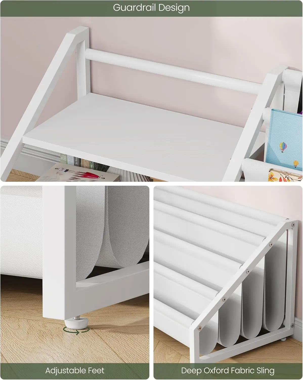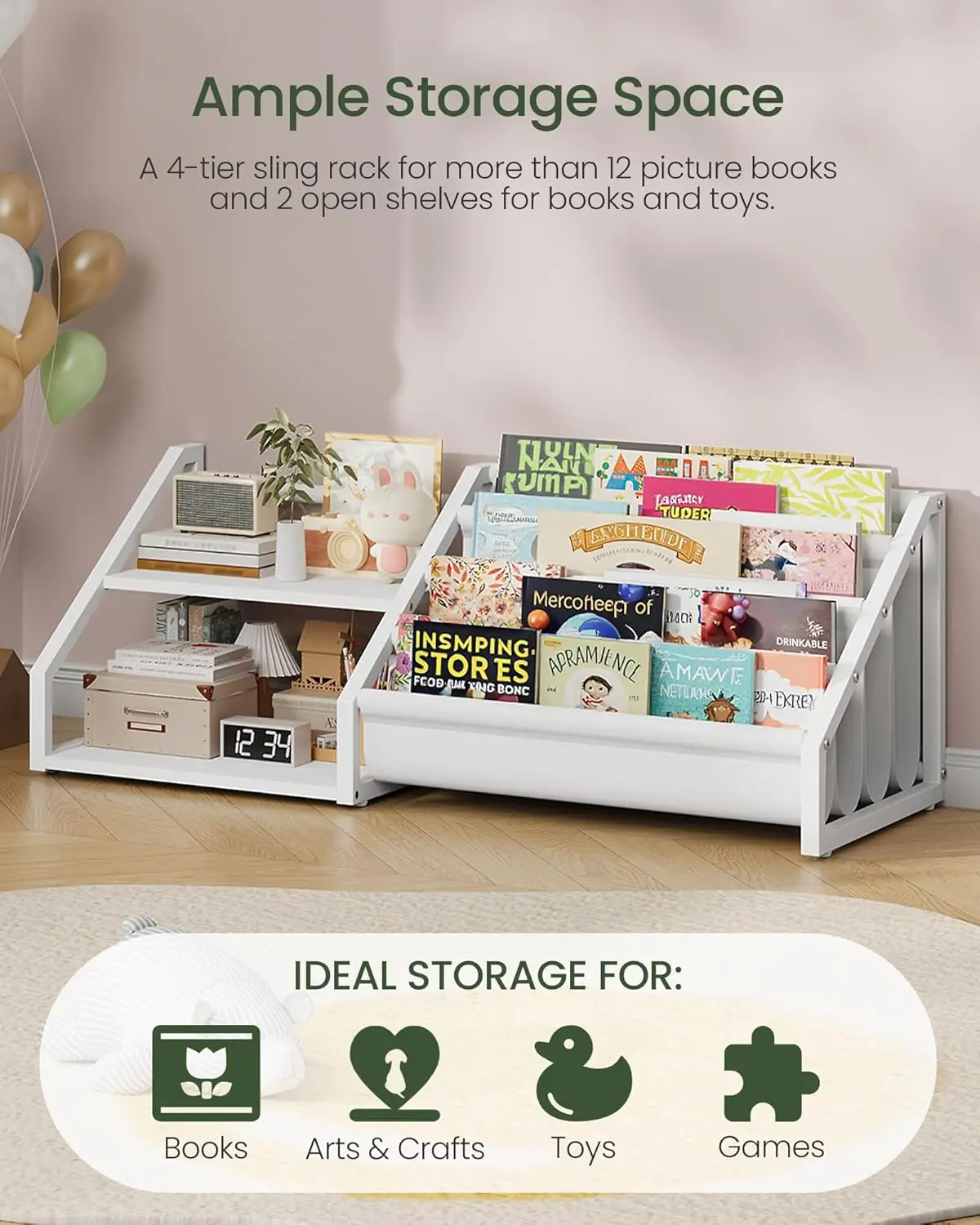 Multi-Functional Storage Design: Featuring 2 open shelves and a 4-tier Oxford fabric sling rack, this unit provides flexible organization options for children’s books, toys, and other essentials in bedrooms, nurseries, playrooms, or libraries.