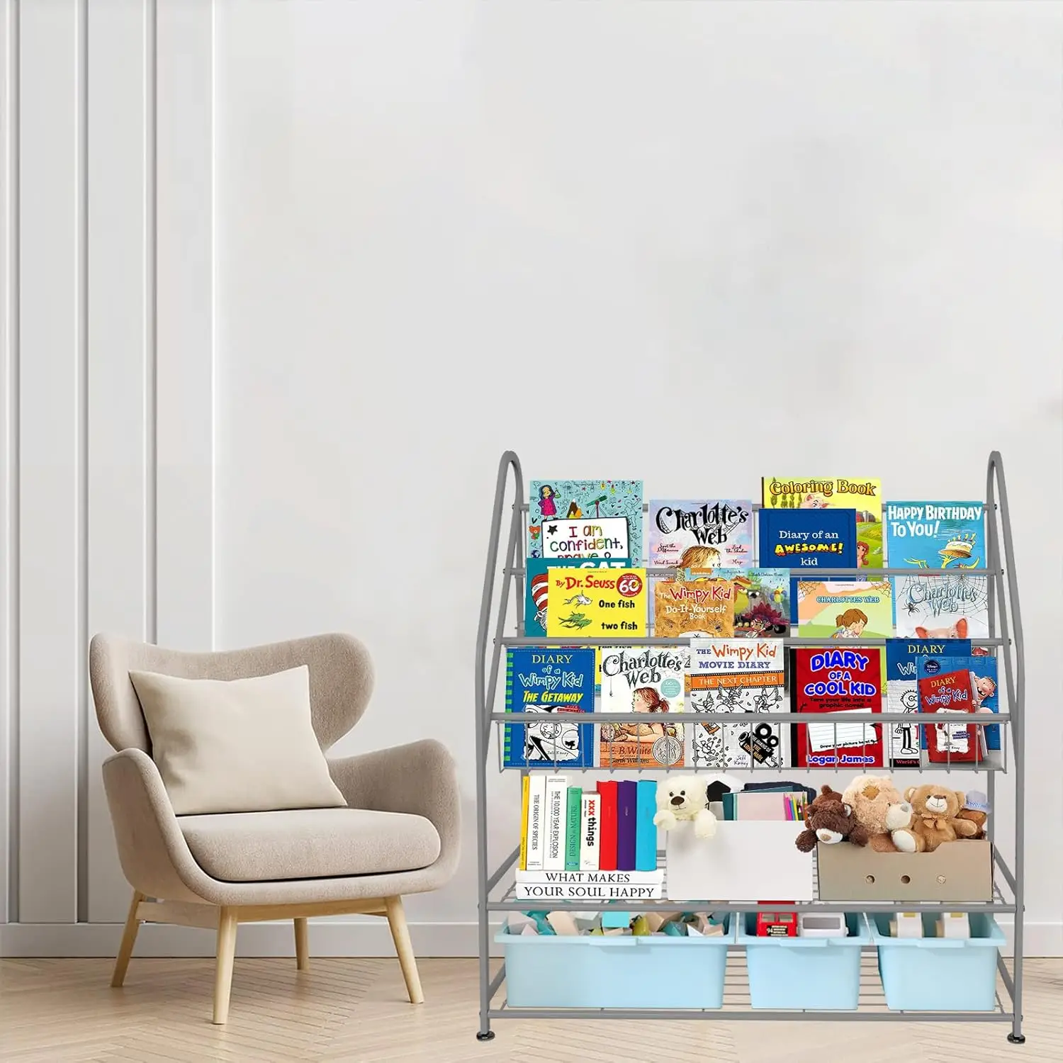6. Versatile Placement Options: Beyond children’s rooms, this freestanding bookcase works wonderfully in various settings, including nurseries, study areas, libraries, daycare centers, and family rooms. Its neutral grey color complements different interior styles seamlessly.