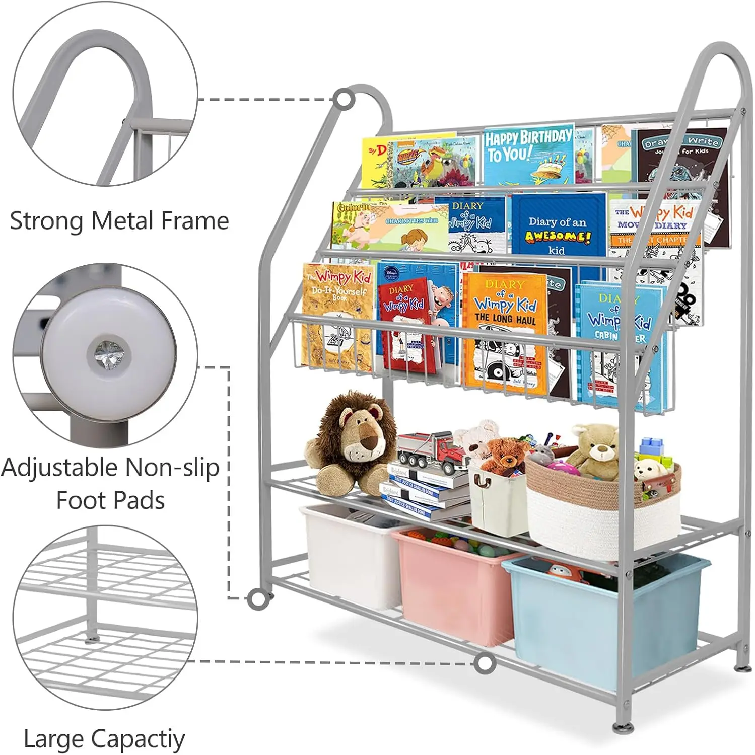 4. Durable Metal Construction: Crafted from high-quality metal materials, this bookcase offers exceptional durability and strength with excellent weight-bearing capacity. The curved edges are thoughtfully designed to protect children from injuries during use, while the fully polished finish helps prevent rust and makes cleaning easy.