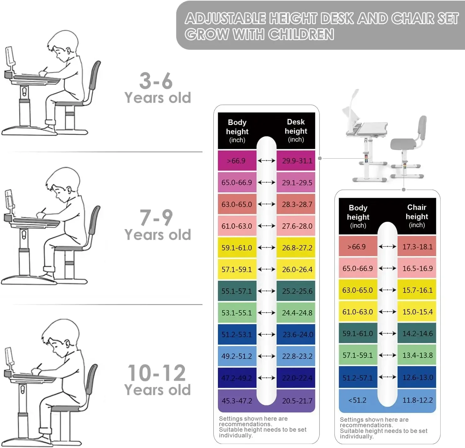 - Adjustable kids study desk set – Height-adjustable desk and chair are designed to grow with your child from ages 3-12, providing a comfortable workstation for homework, reading, and crafts.